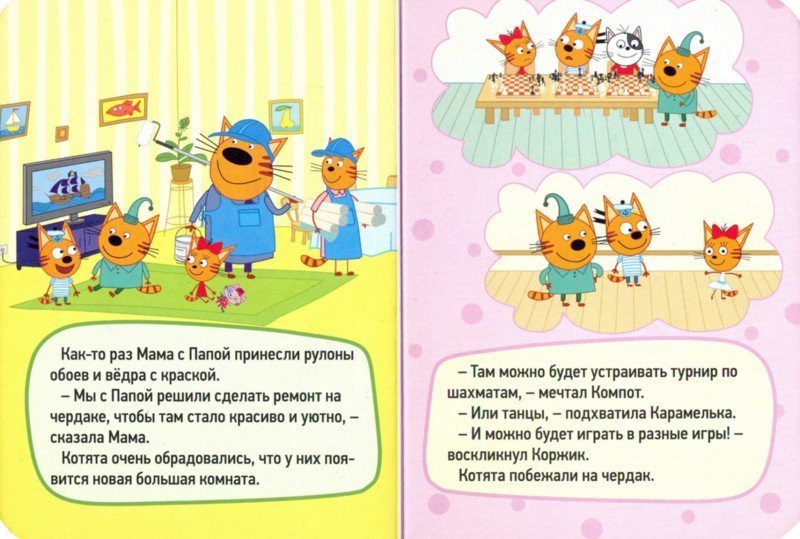 Три кота. РемонтВ данный момент этот товар отсутствует в продаже. Возможно, у нас найдется аналогичный или похожий товар здесь. Серия: Три кота. ЦК-мини Каждый день Коржика, Компота и Карамельки наполнен забавными приключениями. Читайте об этом на страницах новых мини-книг три кота. |