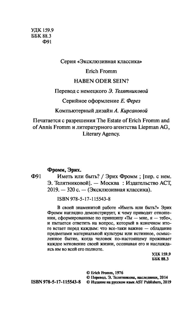 💳 Оплатить за товар можно при получении 🇰🇿 Есть бесплатная доставка по Казахстану 🎁 Копите бонусы с каждой покупки Серия: Эксклюзивная классика (Лучшее) В своей знаменитой работе «Иметь или быть?» Эрих Фромм наглядно демонстрирует, к чему приводят отношения, сформированные по принципу «Ты — мне, я — тебе», и пытается ответить на вопрос, который в конечном итоге встает перед каждым: что все-таки важнее — обладание предметами материальной культуры или истинное, осмысленное бытие, когда человек по-настоящему проживает каждое мгновение своей жизни, осознавая его и наслаждаясь им во всей его полноте? |