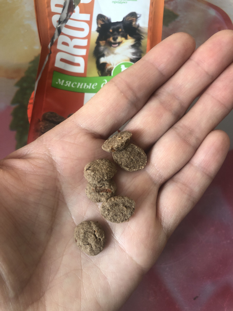 Вкусные дропсы, моим хасям вкус понравился . Размер мелкий для их зубов . Скорее всего они для мелких пород собак.