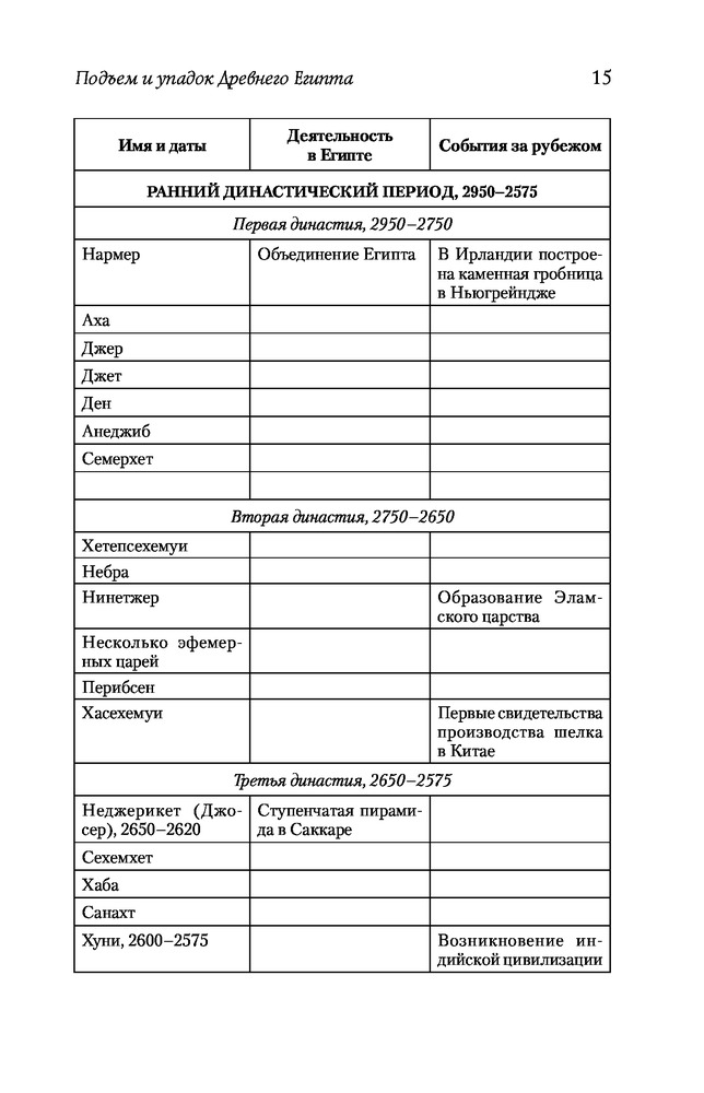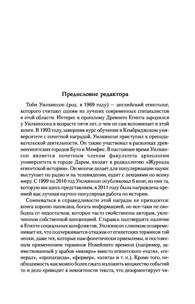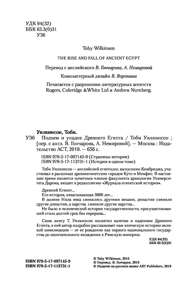 "История могла бы многому гас научить, если бы мы прилежно усваивали ее уроки" (С.Т. Кольридж). "Древний Египет. Подъем и упадок" - достаточно неплохая научно-популярная книга британского историка, египтолога, доктора философии, профессора, руководителя отдела международной стратегии в Кембриджском университете - Тоби Александра Ховарда Уилкинсона [Toby Alexander Howard Wilkinson]. Впервые данная работа была опубликована в 2010 году, а в 2011 году ее автор стал лауреатом премии Хесселла-Тилтмана , присуждаемой лучшему документальному произведению исторического содержания. Книга интересна, познавательна, снабжена примечаниями научной редакции издательства АСТ, читается легко. Как пишет автор: "Цель этой книги - дать более полную и взвешенную картину древнеегипетской цивилизации, чем та, которую мы часто видим на страницах научных и популярных сочинений. Я решил показать взлеты и падения, успехи и неудачи, отвагу и жестокость - все то, из чего состояла жизнь при фараонах". Читайте, делайте свои выводы. Качество издания хорошее.