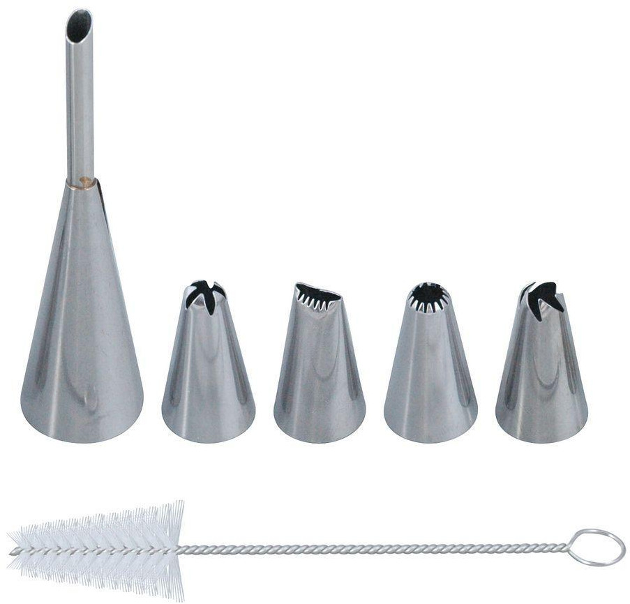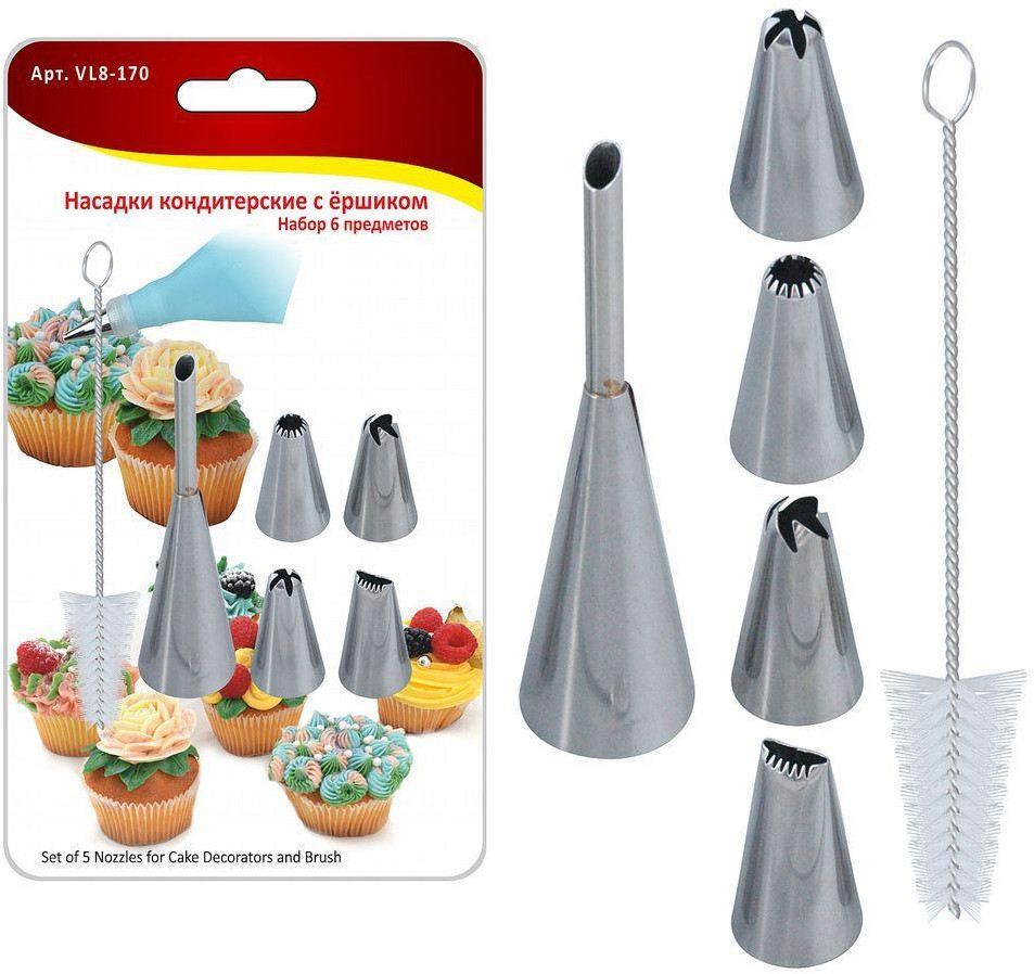 💳 Оплатить за товар можно при получении 🇰🇿 Есть бесплатная доставка по Казахстану от 1 дня 🎁 Копите бонусы с каждой покупки В набор входит 5 кондитерских насадок и ершик для их очистки. С помощью этих этих приспособлений можно создавать оригинальные рисунки на тортах, пирожных и печеньях. |