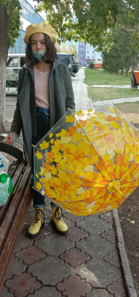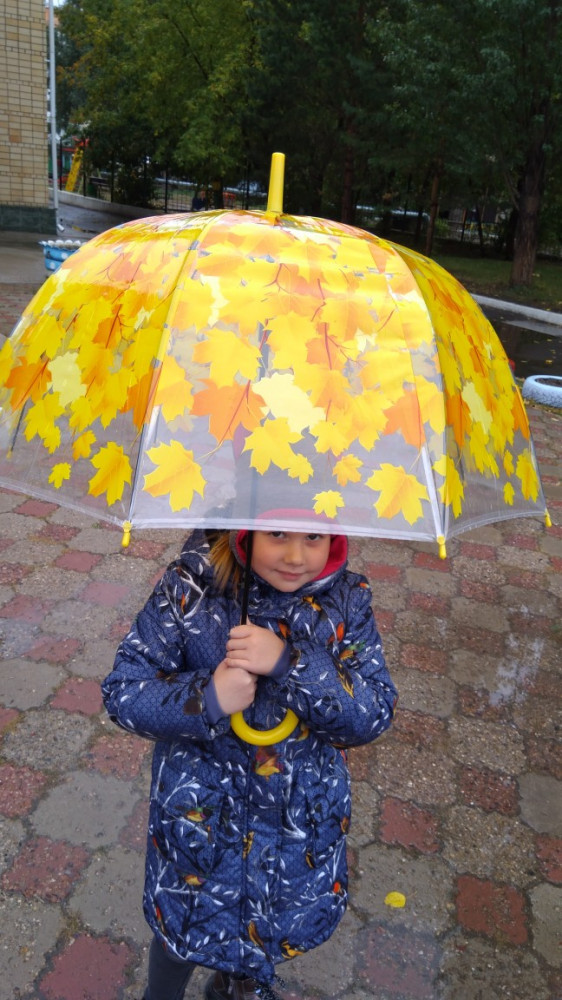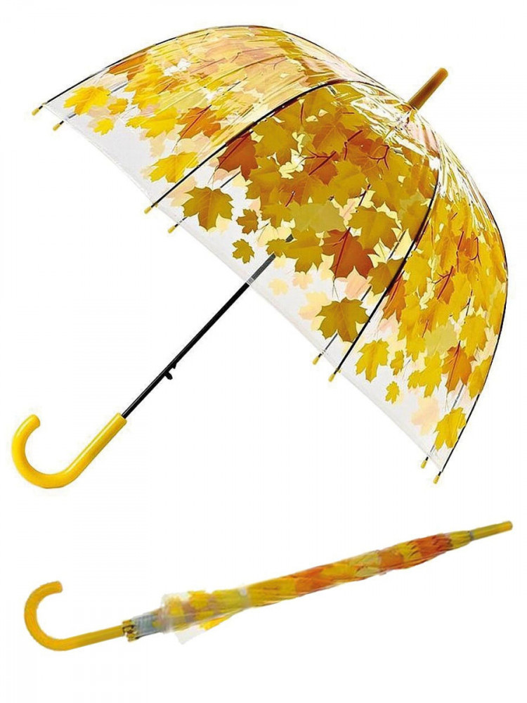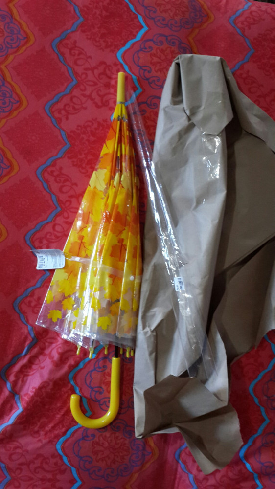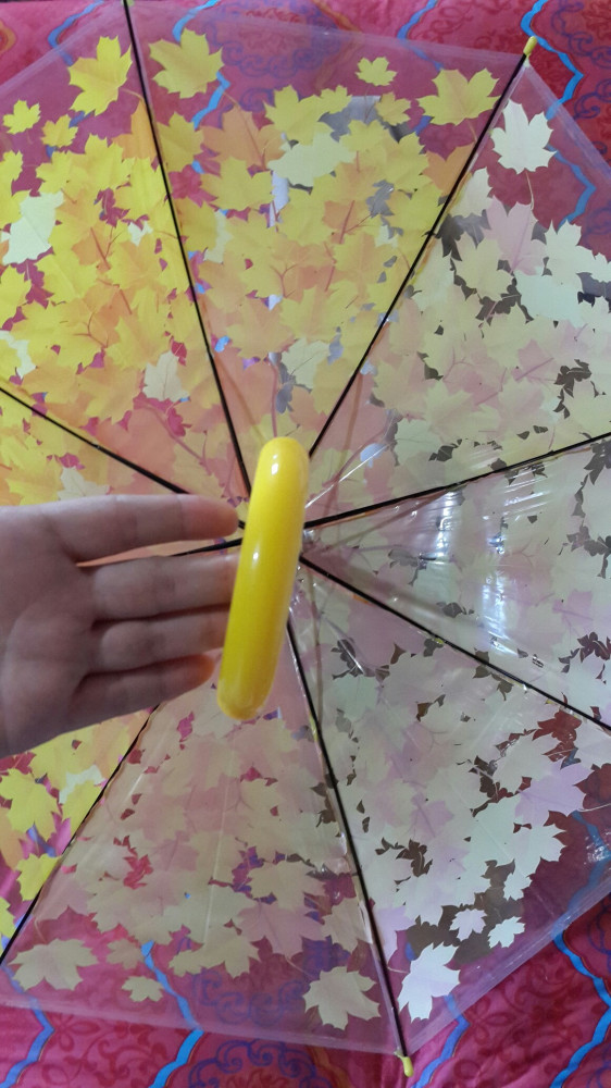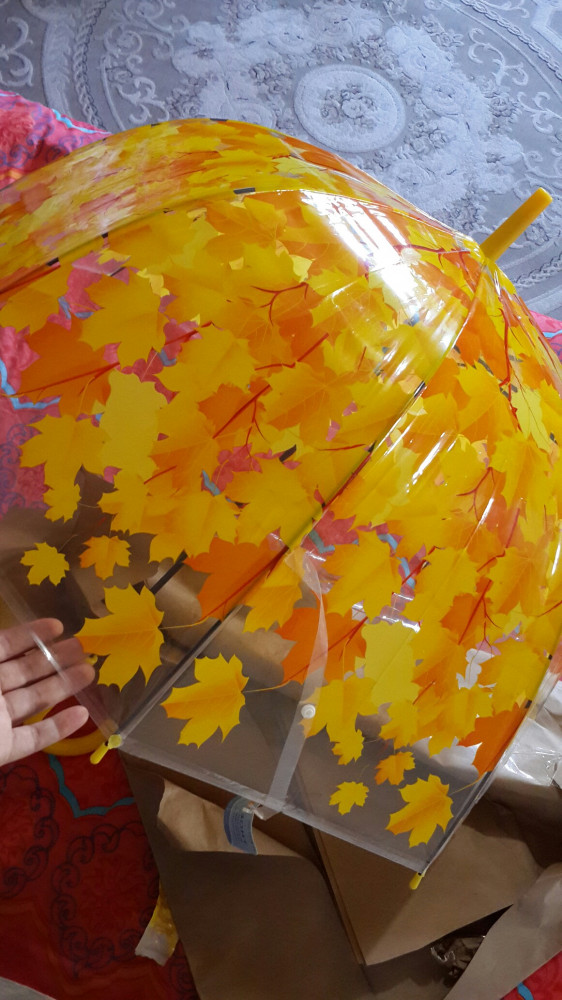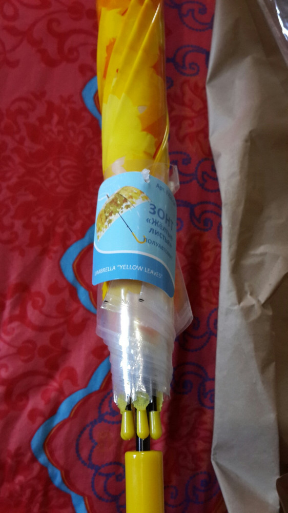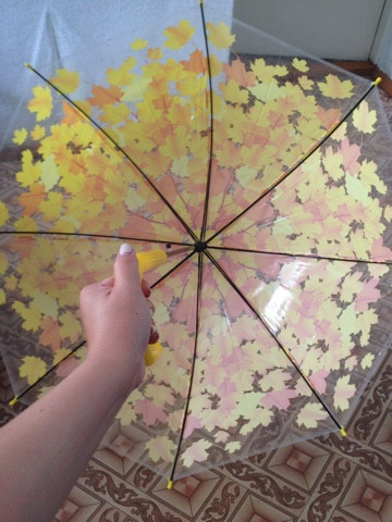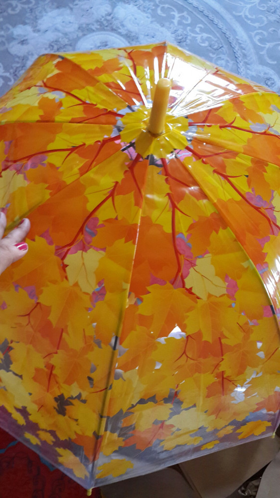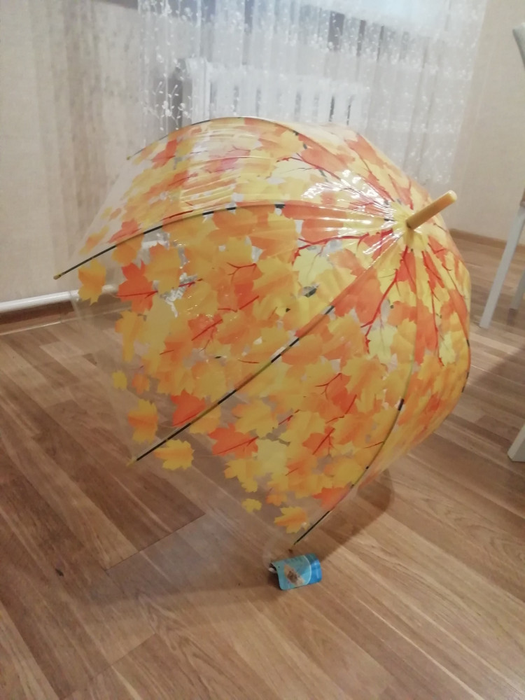 Зонт очень яркий, красивый, жёлтые листья - рисунок позитивный. Зонт не складной, с пластмассовой ручкой, в прозрачном чехольчике.