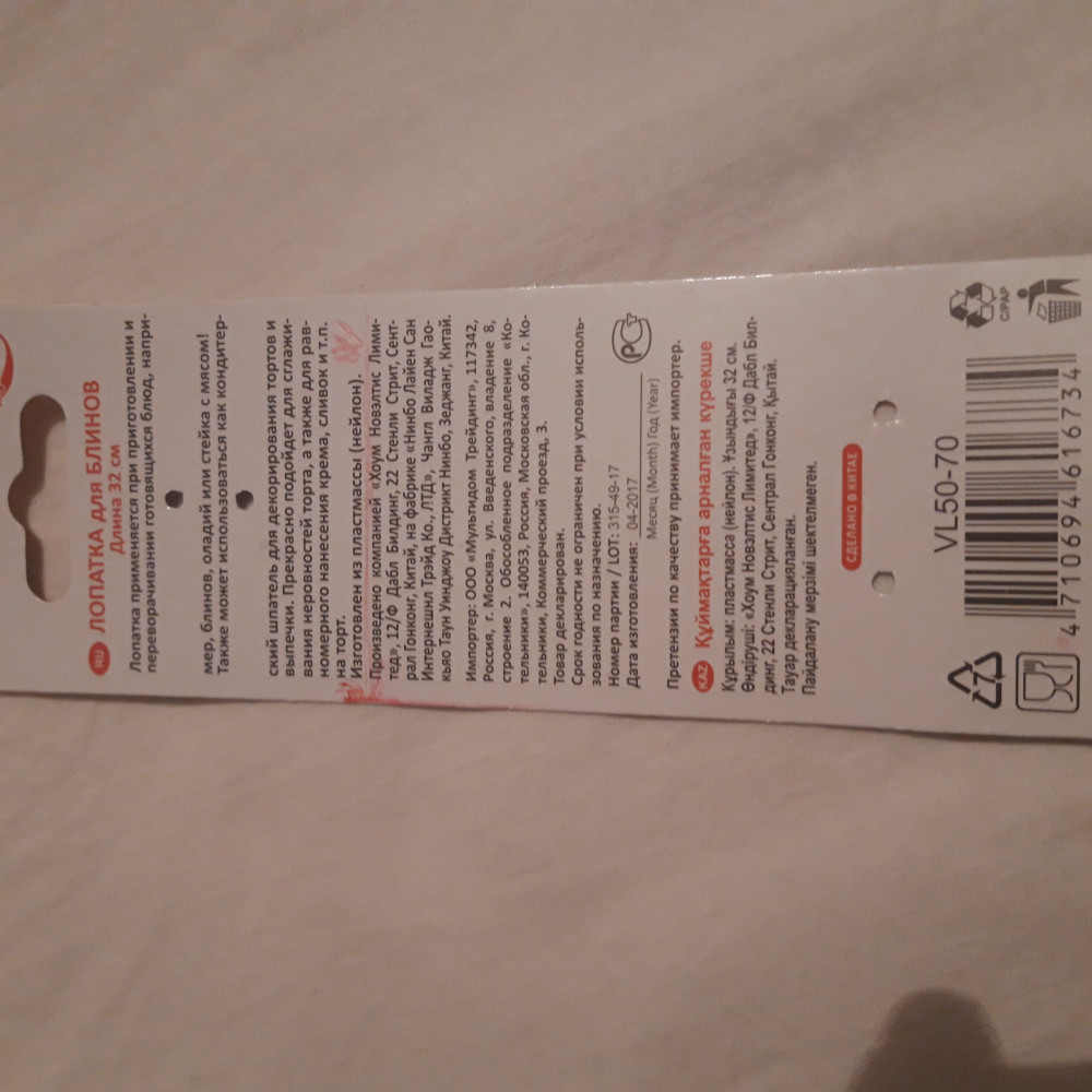 Когда приобрела лопатку была очень довольна, т.к. очень хороший и удобный размер для выпечки блинов, но лопатка разочаровала, после первой же выпечки блинов стала плавиться. Считаю,что для высоких температур её нельзя использовать, если только что-то подать ей.