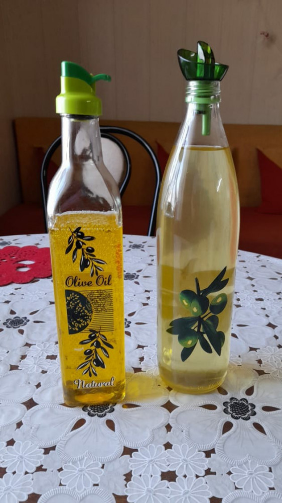 Бутылка для масла из стекла, внешний вид симпатичный, удобная в использовании.