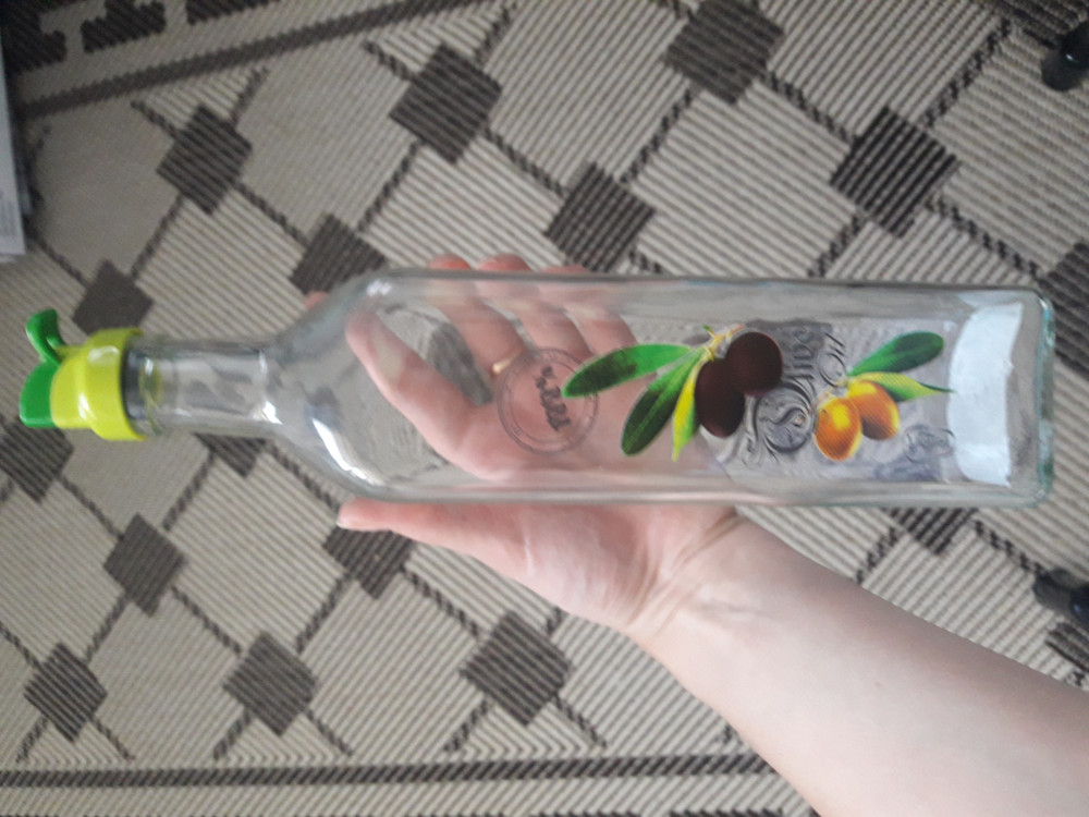 Немного не рассчитала объем, а так бутылка очень большая и тяжелая. Крышка ее не совсем удобная, чтобы налить туда масло.