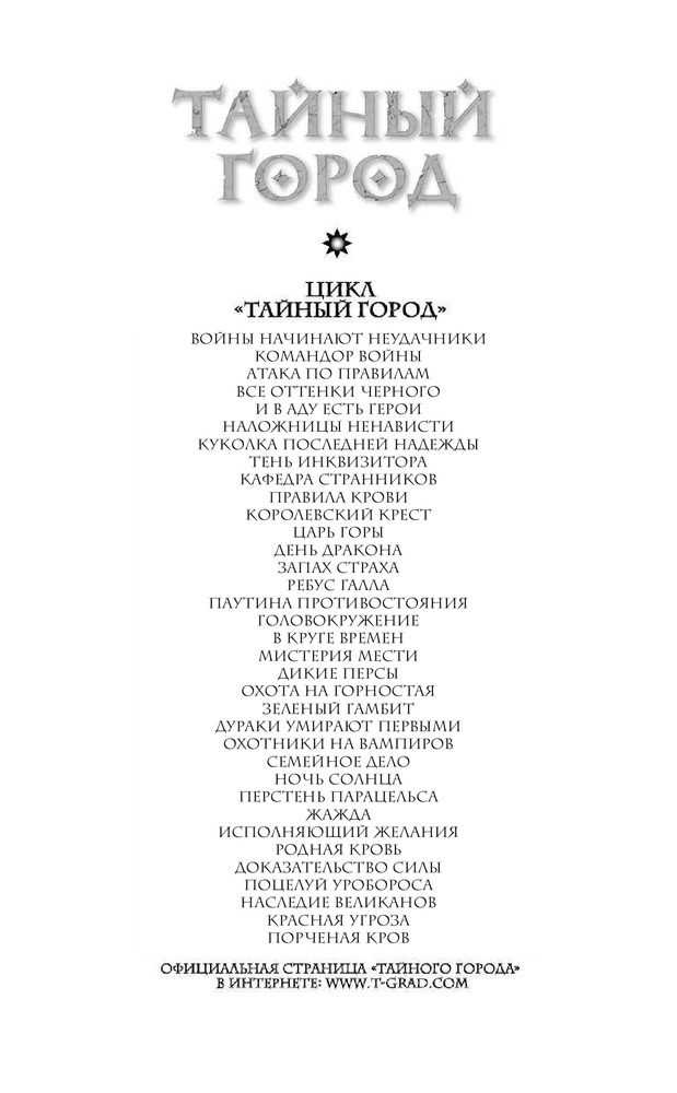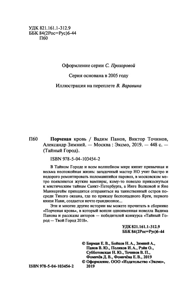Порченая кровьВадим Юрьевич Панов, Александр Зимний, Виктор Павлович Точинов В данный момент этот товар отсутствует в продаже. Возможно, у нас найдется аналогичный или похожий товар здесь. Серия: Тайный город. Мистическая городская фэнтези В Тайном городе и всем волшебном мире кипит привычная и весьма неспокойная жизнь: загадочный мастер но учит быстро и недорого ремонтировать поломавшийся паровоз, в московском метро появляются жуткие вампиры, кому-то повезло прикоснуться к мистическим тайнам Санкт-Петербурга, а Инге Волковой и Яне Маннергейм приходится отправиться на таинственный остров посреди Тихого океана, где по приказу беспощадного Ярги, первого князя Нави, создается нечто грандиозное... |