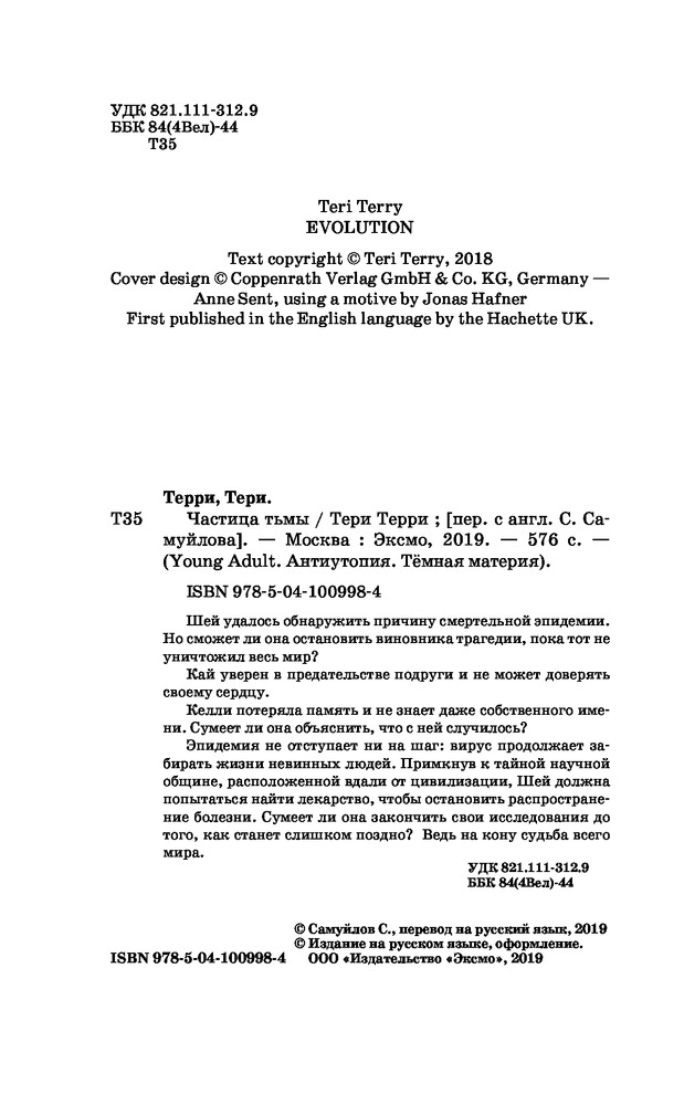 В данный момент этот товар отсутствует в продаже. Возможно, у нас найдется аналогичный или похожий товар здесь. Серия: Young Adult. Антиутопия. Тёмная материя Шей удалось обнаружить причину смертельной эпидемии. Но сможет ли она остановить виновника трагедии, пока тот не уничтожил весь мир? Кай уверен в предательстве подруги и не может доверять своему сердцу. Келли потеряла память и не знает даже собственного имени. Сумеет ли она объяснить, что с ней случилось? Эпидемия не отступает ни на шаг: вирус продолжает забирать жизни невинных людей. Примкнув к тайной научной общине, расположенной вдали от цивилизации, Шей должна попытаться найти лекарство, чтобы остановить распространение болезни. Сумеет ли она закончить свои исследования до того, как станет слишком поздно? Ведь на кону судьба всего мира. |