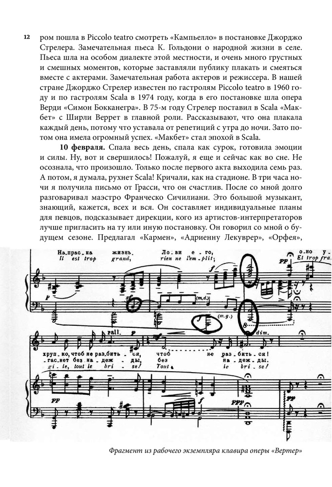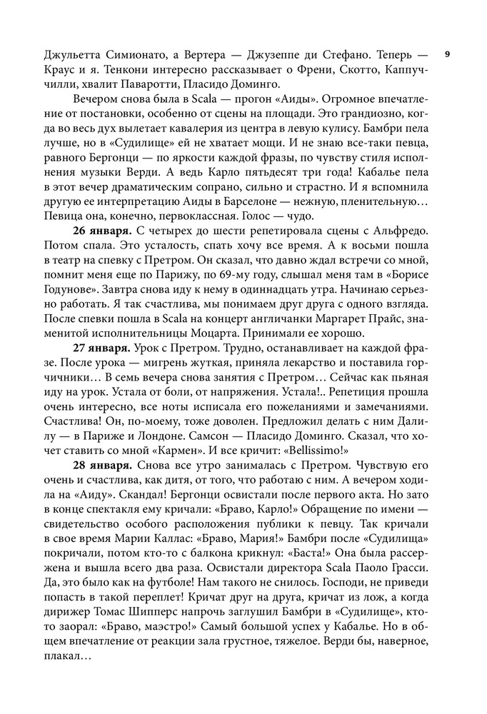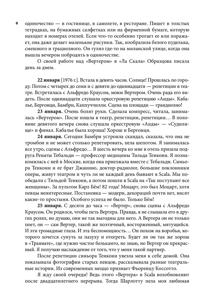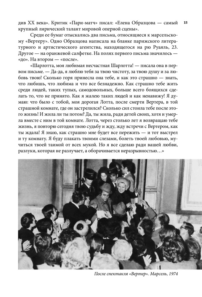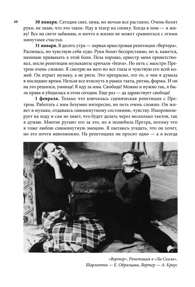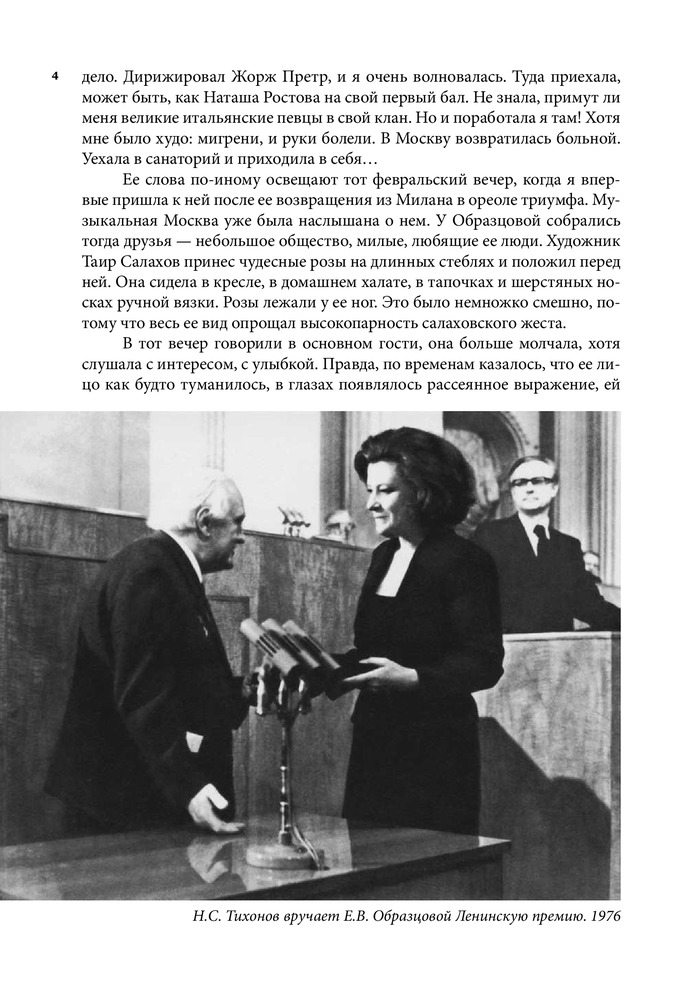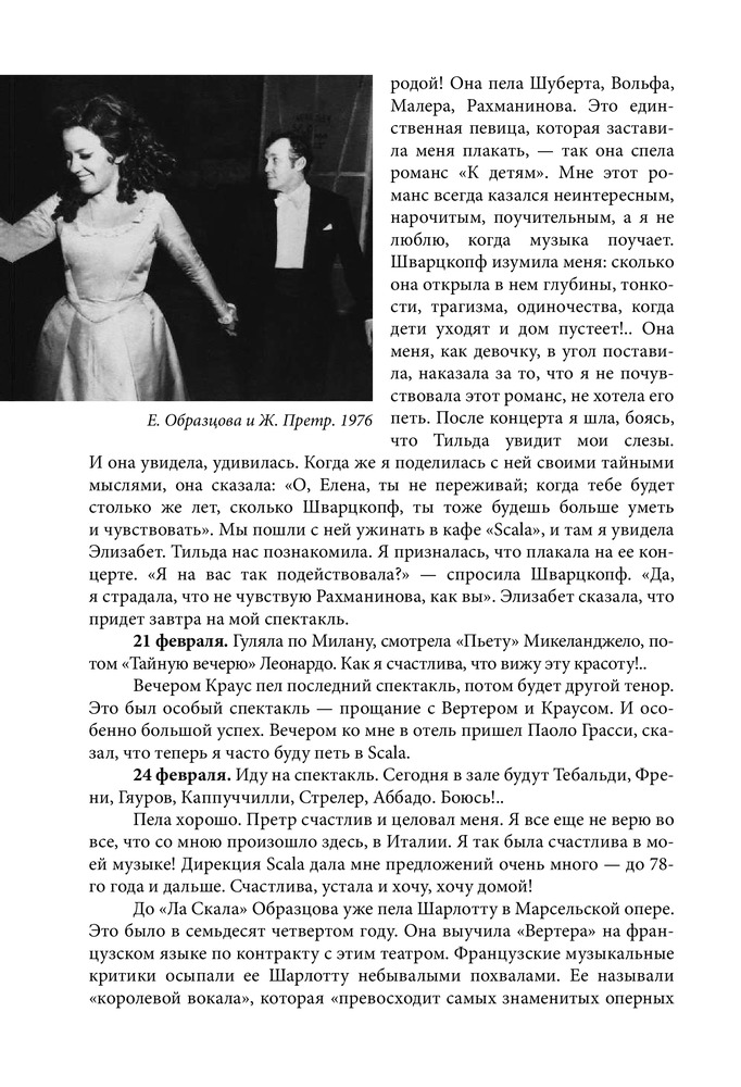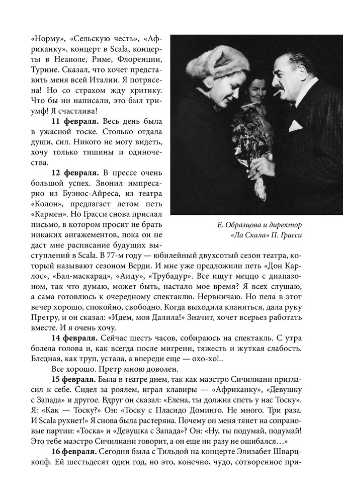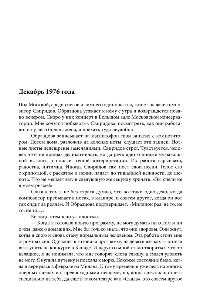 Серия: Большая биография Настоящая книга посвящена жизни и творчеству всемирно известной певицы, народной артистки СССР Елены Васильевны Образцовой. Перед читателем предстает образ удивительно обаятельного человека, беспокойного художника с его радостями, тревогами и надеждами, для которого искусство было смыслом всей жизни. В книгу вошли дневниковые записи Елены Образцовой, ее рассказы о семье, учителях, педагогах Ленинградской консерватории, концертмейстерах А.П. Ерохине, В.Н. Чачаве, о работе над оперными партиями и выступлениями в Большом театре, беседы с певицей автора самой книги И.П. Шейко. Особое место занимает повествование о работе певицы с композитором Г.В. Свиридовым, Московским камерным хором В.Н. Минина, о творческих встречах с зарубежными музыкантами и знаменитыми оперными артистами, среди которых Г. Караян, К. Аббадо, М. Кабалье, Р. Скотто, А. Краус, П. Доминго, Ф. Дзеффирелли и другие. Издание органично дополняют впервые публикующиеся «Листки из блокнота», раскрывающие богатый духовный мир Елены Образцовой, и многочисленные фотографии, развивающие и дополняющие основные темы книги. |