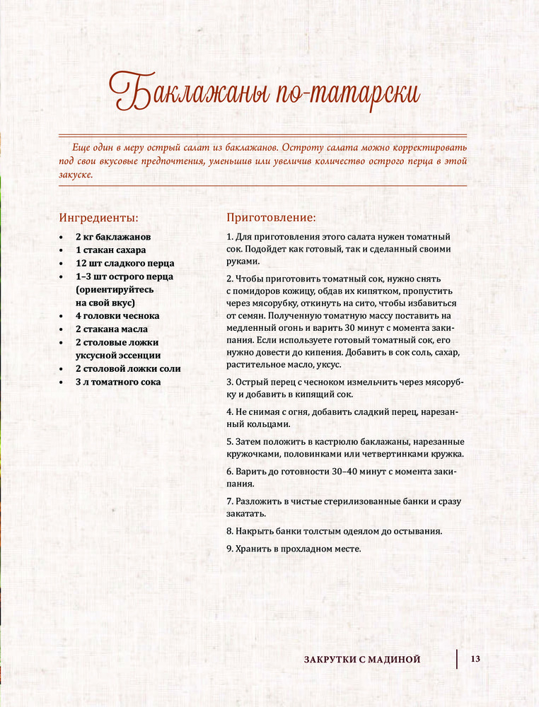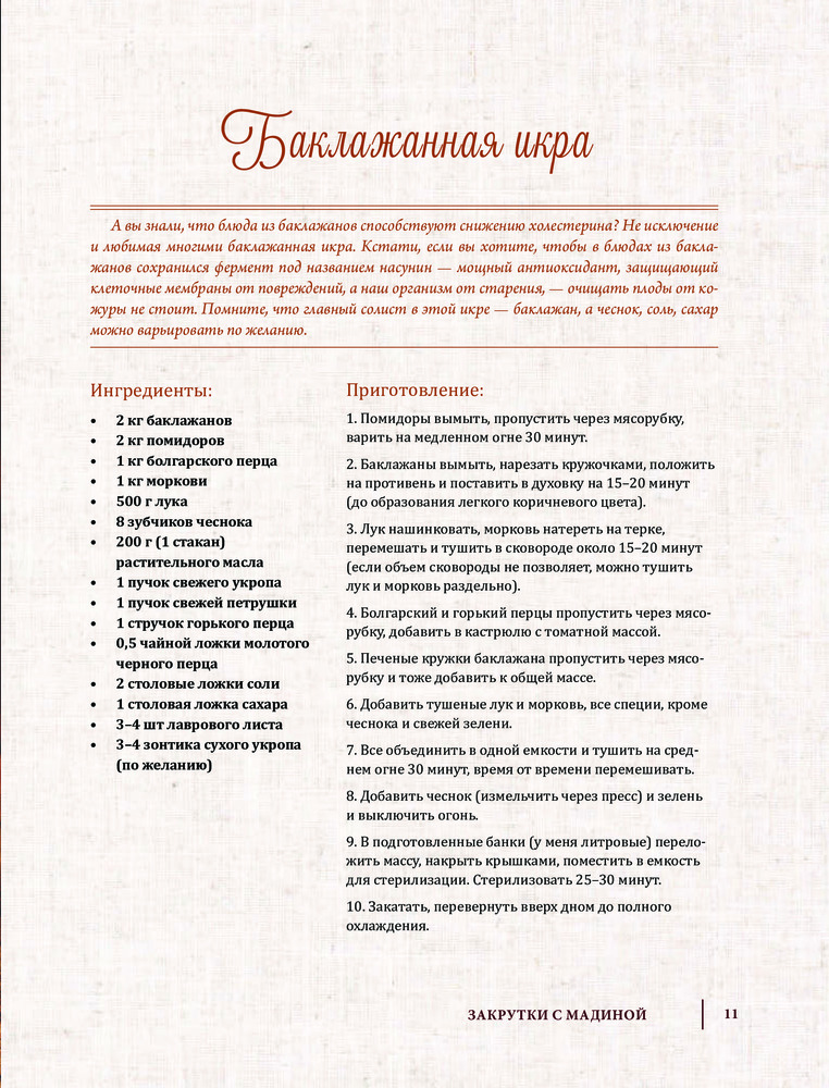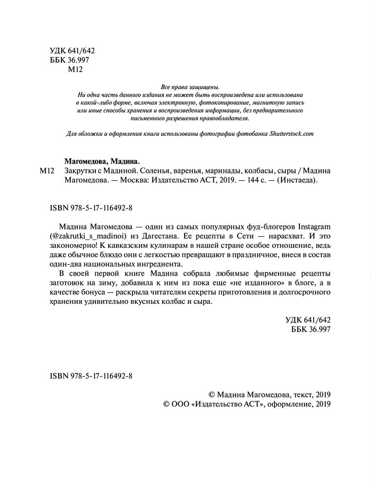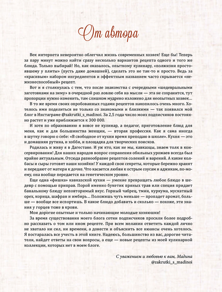 В своей первой книге Мадина собрала любимые фирменные рецепты заготовок на зиму, добавила к ним из пока еще «не изданного» в блоге, а в качестве бонуса — раскрыла читателям секреты приготовления и долгосрочного хранения удивительно вкусных колбас и сыра. |
