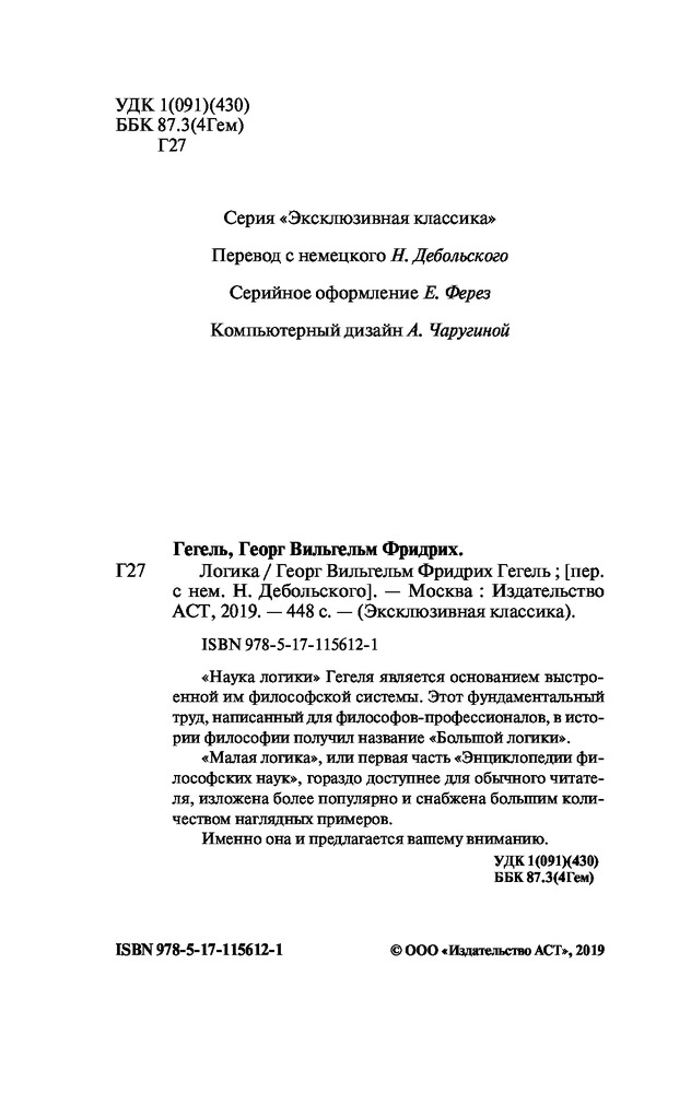 💳 Оплатить за товар можно при получении 🇰🇿 Есть бесплатная доставка по Казахстану от 1 дня 🎁 Копите бонусы с каждой покупки Серия: Эксклюзивная классика «Наука логики» Гегеля является основанием выстроенной им философской системы. Это фундаментальный труд, написанный для философов-профессионалов, в истории философии получил название «Большой логики». «Малая логика», или первая часть «Энциклопедии философских наук», гораздо доступнее для обычного читателя, изложена более популярно и снабжена большим количеством наглядных примеров. Именно она и предлагается вашему вниманию. |