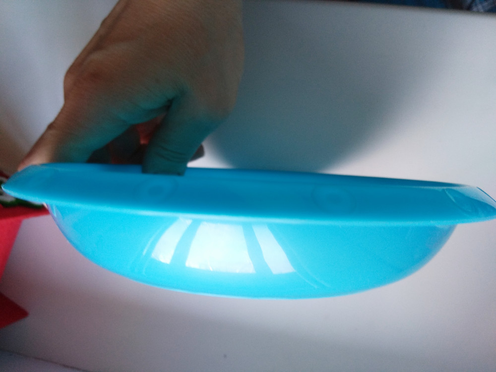 Глубокенькая тарелочка из плотного пластика. Красный стикер легко удаляется.