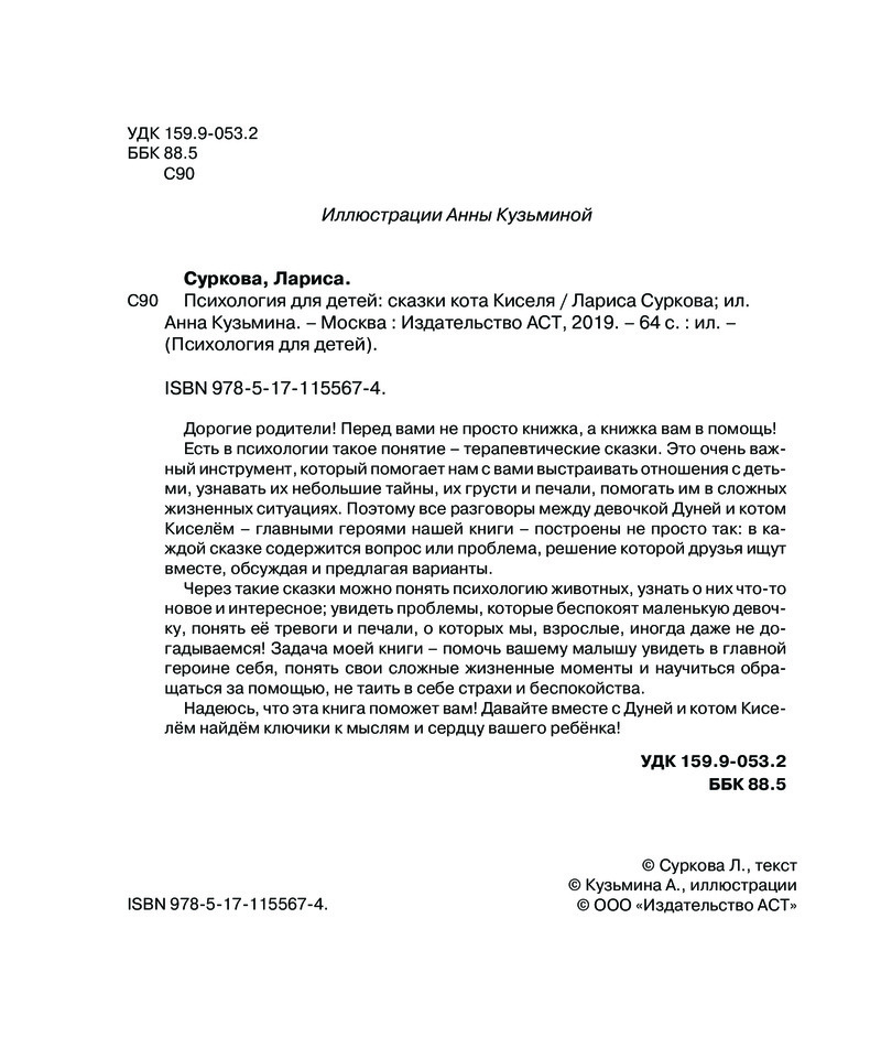 💳 Оплатить за товар можно при получении 🇰🇿 Есть бесплатная доставка по Казахстану от 1 дня 🎁 Копите бонусы с каждой покупки Серия: Психология для детей Дорогие родители! Перед вами не просто книжка, а книжка вам в помощь! Есть в психологии такое понятие — терапевтические сказки. Это очень важный инструмент, который помогает нам с вами выстраивать отношения с детьми, узнавать их небольшие тайны, их грусти и печали, помогать им в сложных жизненных ситуациях. Поэтому все разговоры между девочкой Дуней и котом Киселём — главными героями нашей книги — построены не просто так: в каждой сказке содержится вопрос или проблема, решение которой друзья ищут вместе, обсуждая и предлагая варианты. Через такие сказки можно понять психологию животных, узнать о них что-то новое и интересное; увидеть проблемы, которые беспокоят маленькую девочку, понять её тревоги и печали, о которых мы, взрослые, иногда даже не догадываемся! Задача моей книги — помочь вашему малышу увидеть в главной героине себя, понять свои сложные жизненные моменты и научиться обращаться за помощью, не таить в себе страхи и беспокойства. Надеюсь, что эта книга поможет вам! Давайте вместе с Дуней и котом Киселём найдём ключики к мыслям и сердцу вашего ребёнка! |