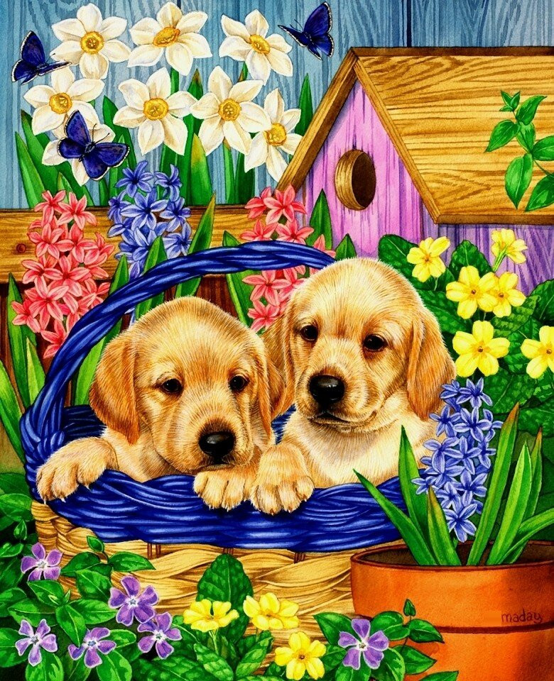 Используя набор юного художника, можно нарисовать двух щенков лабрадора в корзине среди ярких цветов. На холст уже нанесен контур изображения с разбивкой на сегменты с номерами. Цветовая схема показывает какому номеру какой цвет краски соответствует. Рисование по номерам развивает моторику рук, внимание и память.
