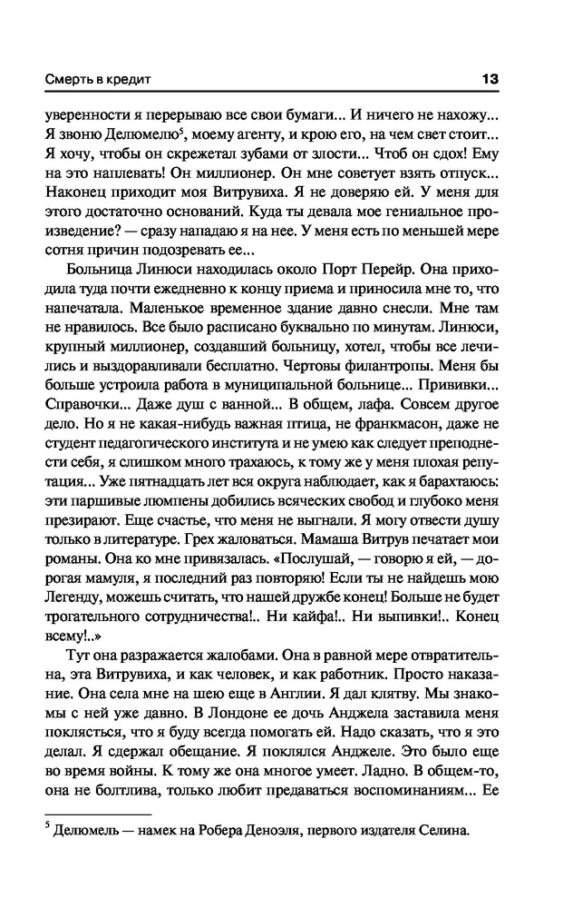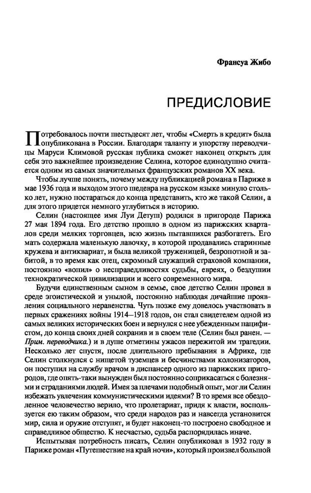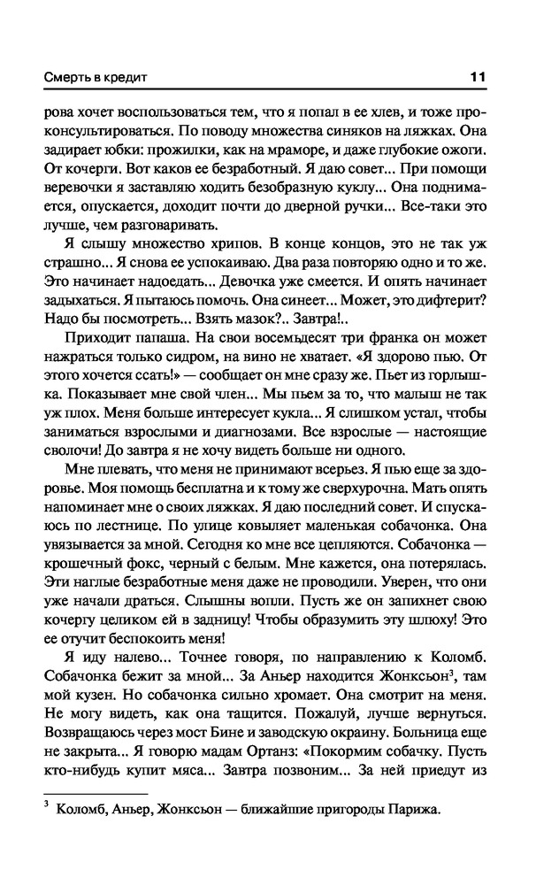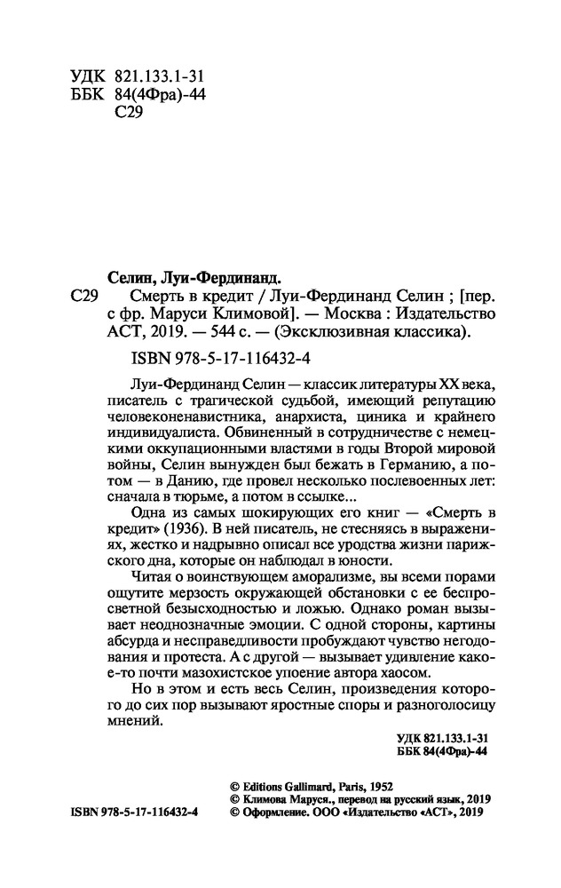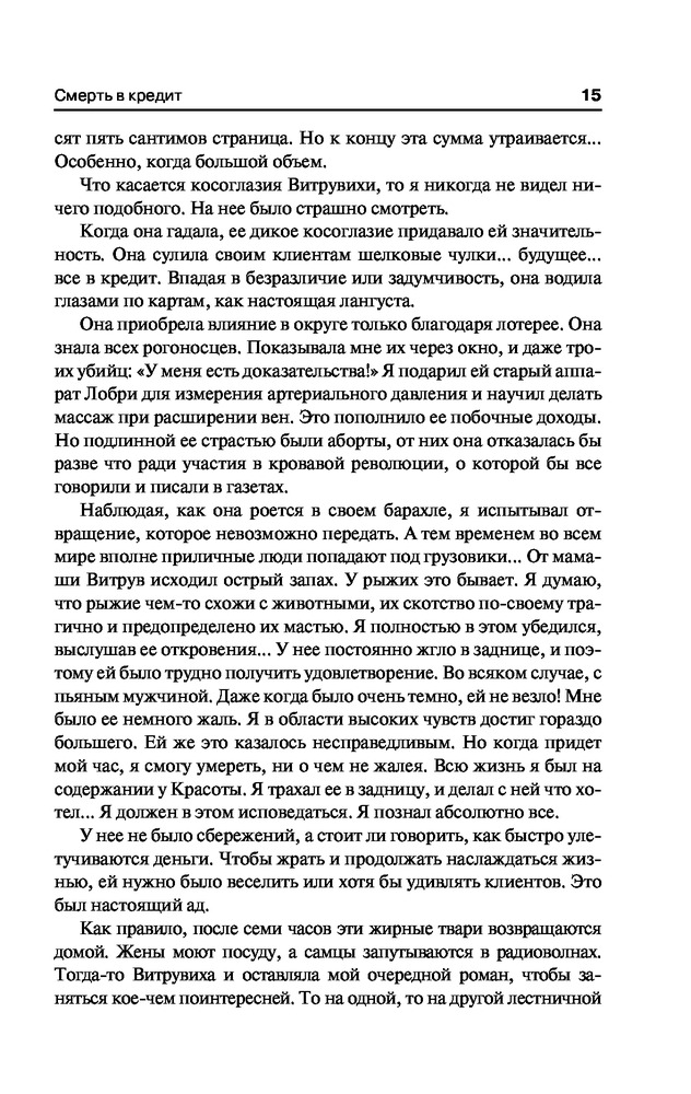 Серия: Эксклюзивная классика Луи-Фердинанд Селин — классик литературы ХХ века, писатель с трагической судьбой, имеющий репутацию человеконенавистника, анархиста, циника и крайнего индивидуалиста. Обвиненный в сотрудничестве с немецкими оккупационными властями в годы Второй мировой войны Селин вынужден был бежать в Германию, а потом — в Данию, где проводит несколько послевоенных лет: сначала в тюрьме, а потом в ссылке... Одна из самых шокирующих его книг — «Смерть в кредит» (1936). В ней писатель,не стесняясь в выражениях, жестко и надрывно описал все уродства жизни парижского дна, которые он наблюдал в юности. Читая о воинствующем аморализме, вы всеми порами ощутите мерзость окружающей обстановки с ее беспросветной безысходностью и ложью. Однако роман вызывает неоднозначные эмоции. С одной стороны, картины абсурда и несправедливости пробуждают чувство негодования и протеста. А с другой — вызывает удивление какое-то почти мазохистское упоение автора хаосом. Но в этом и есть весь Селин, произведения которого до сих пор вызывают яростные споры и разноголосицу мнений. |