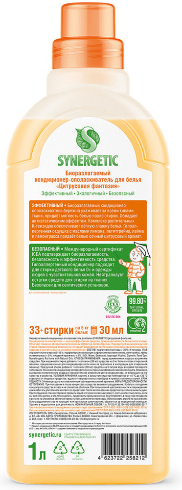 Synergetic Кондиционер-ополаскиватель гипоаллергенный для белья «Цитрусовая фантазия»