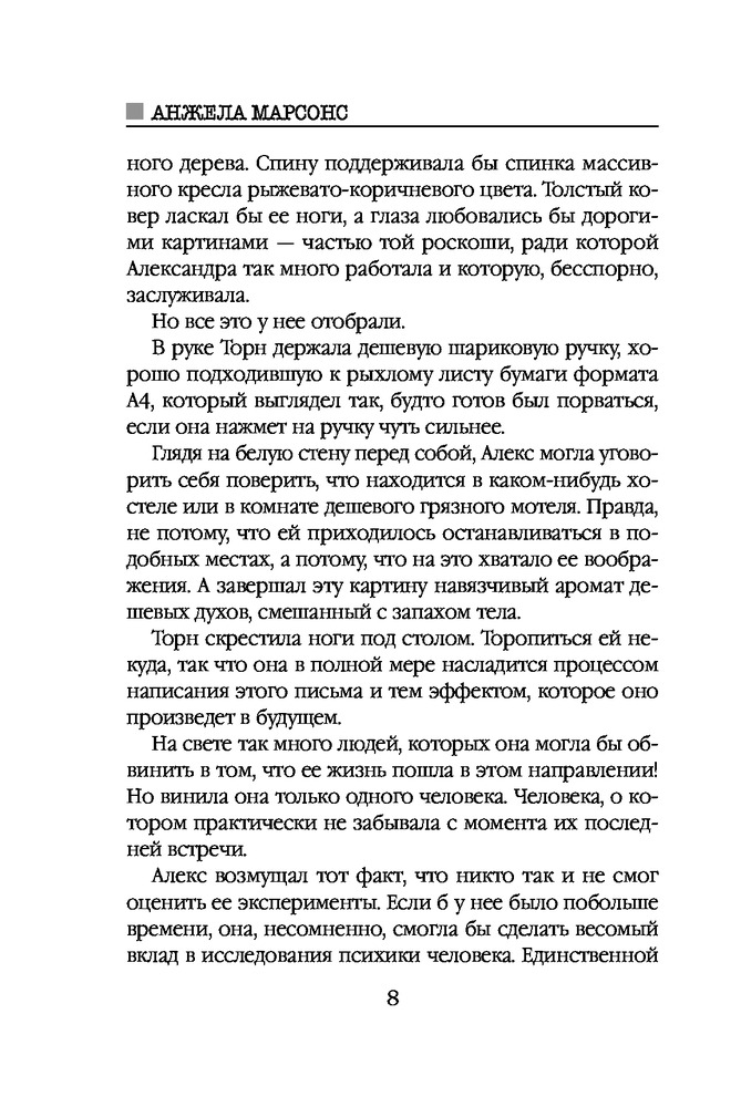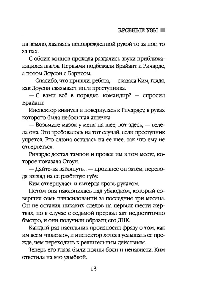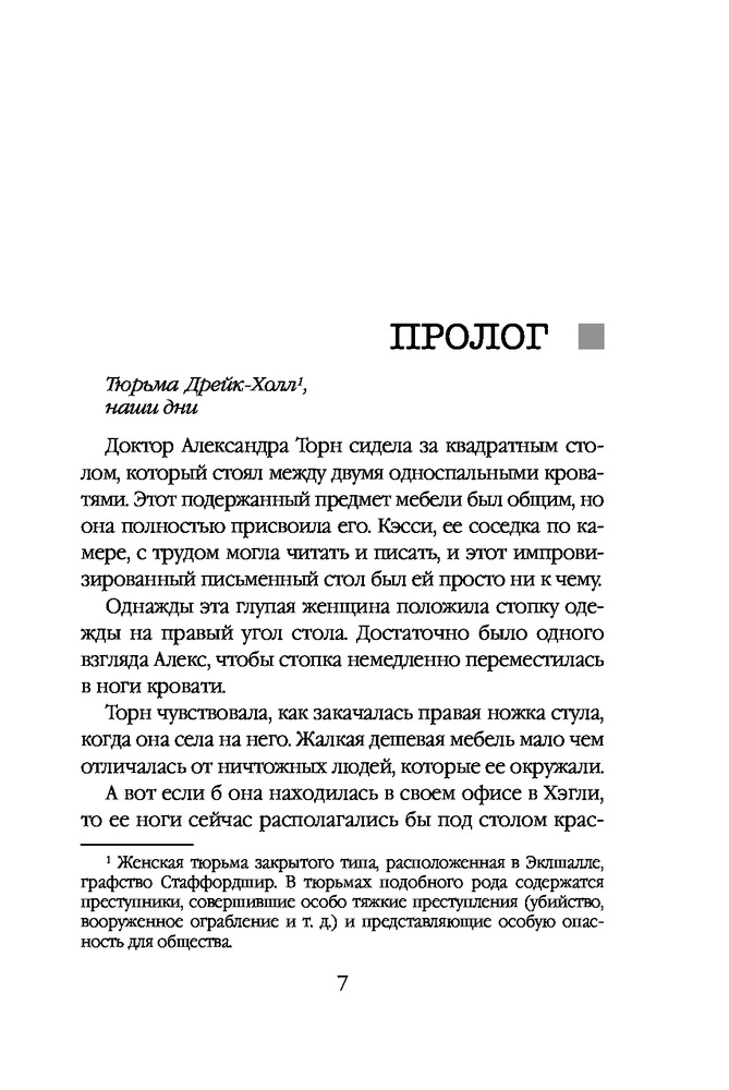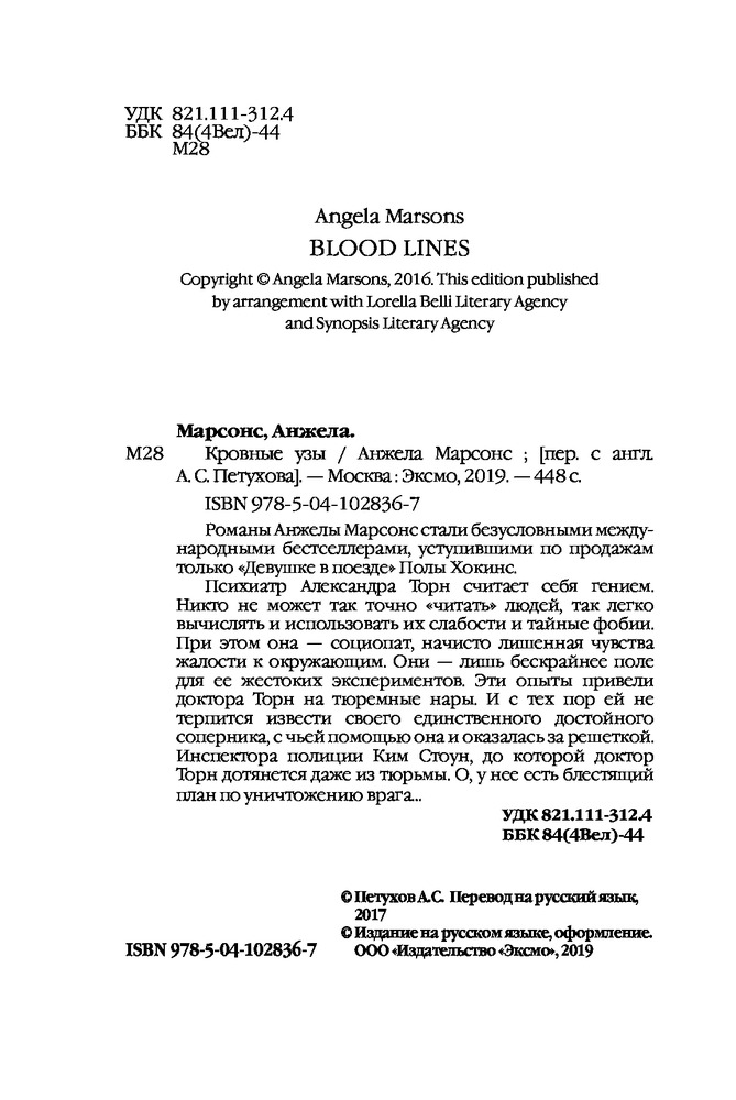 Кровные узыВ данный момент этот товар отсутствует в продаже. Возможно, у нас найдется аналогичный или похожий товар здесь. Серия: Детектив 2.0: мировой уровень (обложка) Романы Анжелы Марсонс стали безусловными международными бестселлерами, уступившими по продажам только «Девушке в поезде» Полы Хокинс.Психиатр Александра Торн считает себя гением. Никто не может так точно «читать» людей, так легко вычислять и использовать их слабости и тайные фобии. При этом она — социопат, начисто лишенная чувства жалости к окружающим. Они — лишь бескрайнее поле для ее жестоких экспериментов. Эти опыты привели доктора Торн на тюремные нары. И с тех пор ей не терпится извести своего единственного достойного соперника, с чьей помощью она и оказалась за решеткой. Инспектора полиции Ким Стоун, до которой доктор Торн дотянется даже из тюрьмы. О, у нее есть блестящий план по уничтожению врага... |