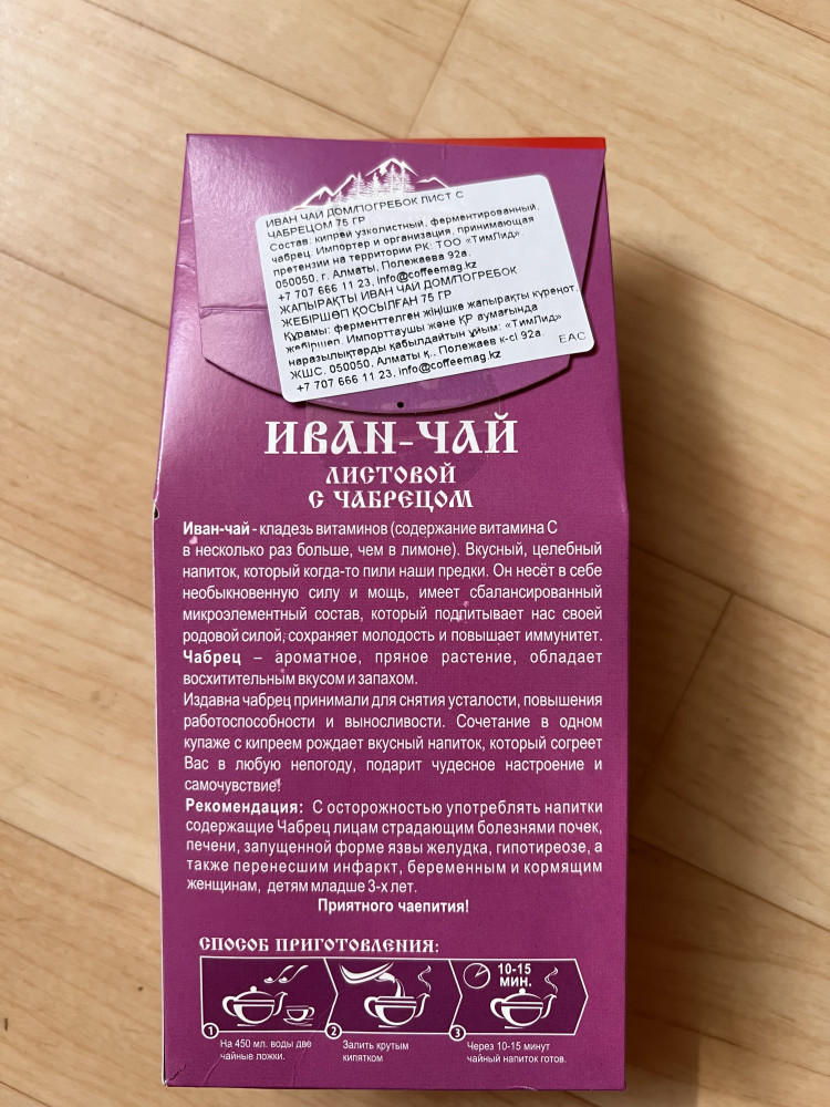 💳 Оплатить за товар можно при получении 🇰🇿 Есть бесплатная доставка по Казахстану от 1 дня 🎁 Копите бонусы с каждой покупки Иван-чай — кладезь витаминов (содержит витамина С в 6 раз больше, чем в лимоне). Вкусный, целебный напиток, который когда-то пили наши предки. Англичане выкупали его за золото, когда владели плантациями чая в Индии. Он несёт в себе необыкновенную силу и мощь, имеет сбалансированный микроэлементный состав, который подпитывает нас своей родовой силой. Чабрец — ароматное, пряное растение, обладает восхитительным вкусом и запахом. Издавна чабрец принимали для снятия усталости, повышения работоспособности и выносливости. Сочетание в одном купаже с кипреем рождает весьма вкусный напиток, который согреет Вас в любую непогоду, подарит чудесное настроение и самочувствие! |