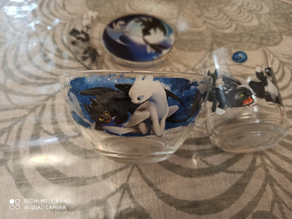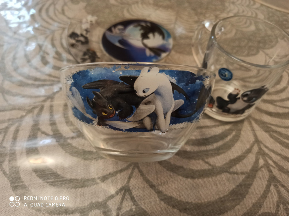 Набор супер очень понравился и нам и ребенку, стекло прозрачное с рисунком двух драконов глубокая тарелка-порция, кружечка устойчивая, для фанатов мультфильма "Как приручить дракона", очень рекомендую, красиво, спасибо.