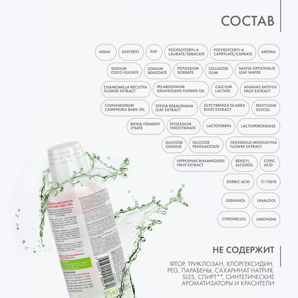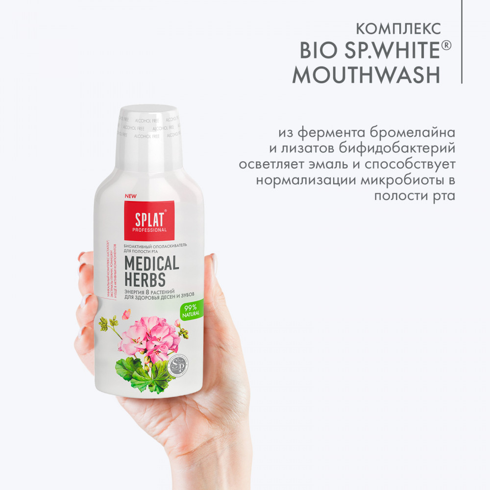 Splat Ополаскиватель для полости рта «Medical herbs»В данный момент этот товар отсутствует в продаже. Возможно, у нас найдется аналогичный или похожий товар здесь. Натуральный ополаскиватель — эффективное профилактическое средство для ежедневного использования. Эфирное масло герани — мощный природный антисептик. Лактат кальция повышает плотность эмали и снижает ее чувствительность. Растительный фермент папаина осветляет эмальдо природного оттенка, эффективно расщепляет зубной налёт. Ополаскиватель прекрасно проникает в труднодоступные места полости рта, обеспечивая абсолютное очищение, и дополняет профилактическое действие зубной пасты. Использовать ополаскиватель рекомендуется после еды и после чистки зубов. |