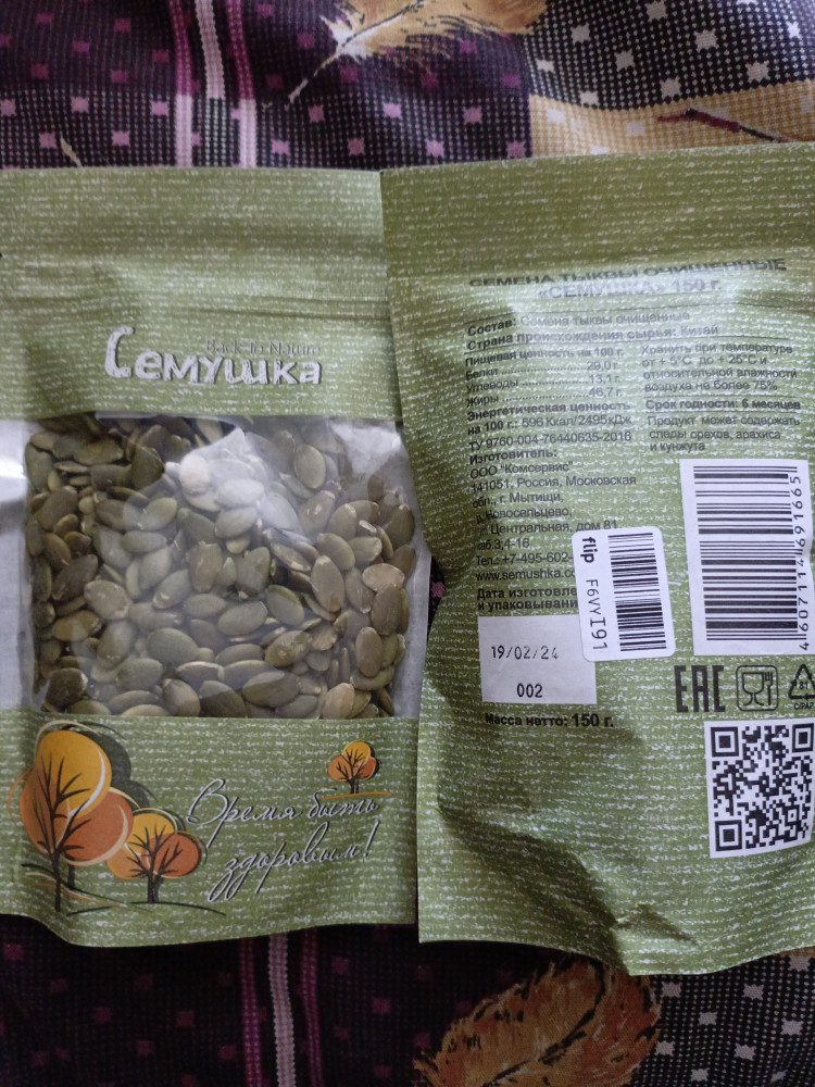 Упаковка красивая,качественная,семечки тоже все красивые, но какие-то слишком зелёные. Было заявлено, что производитель Россия, а то что страна происхождения Китай не написано.