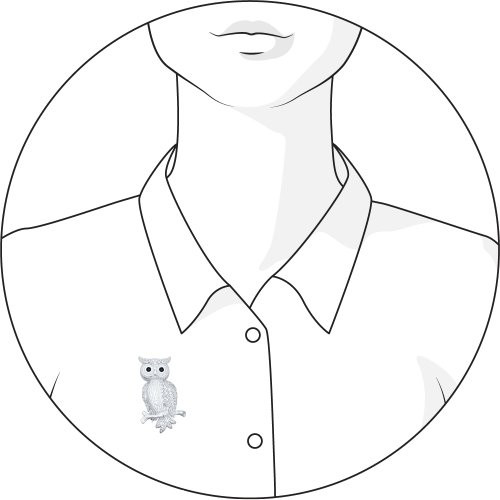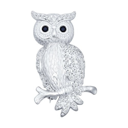 "Совушка" размером около 3,5см. Сделана очень аккуратно, хорошо просматриваются перышки, металл не царапает пальцы, покрытие родием придает брошке светло-серебристый цвет и не даст серебру потемнеть. На ткани брошь выглядит очень достойно.