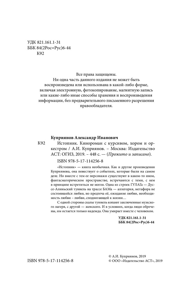 Серия: Прожито и записано «Истопник» — книга необычная. Как и другие произведения Куприянова, она повествует о событиях, которые были на самом деле. Но вместе с тем ее персонажи существуют в каком-то ином, фантасмагорическом пространстве, встречаются с теми, с кем в принципе встретиться не могли. Одна из строек ГУЛАГа — Дуссе-Алиньский туннель на трассе БАМа — аллегория, метафора не состоявшейся любви, но предтеча её, ожидание любви, необходимость любви — любви, сподвигающей к жизни... |