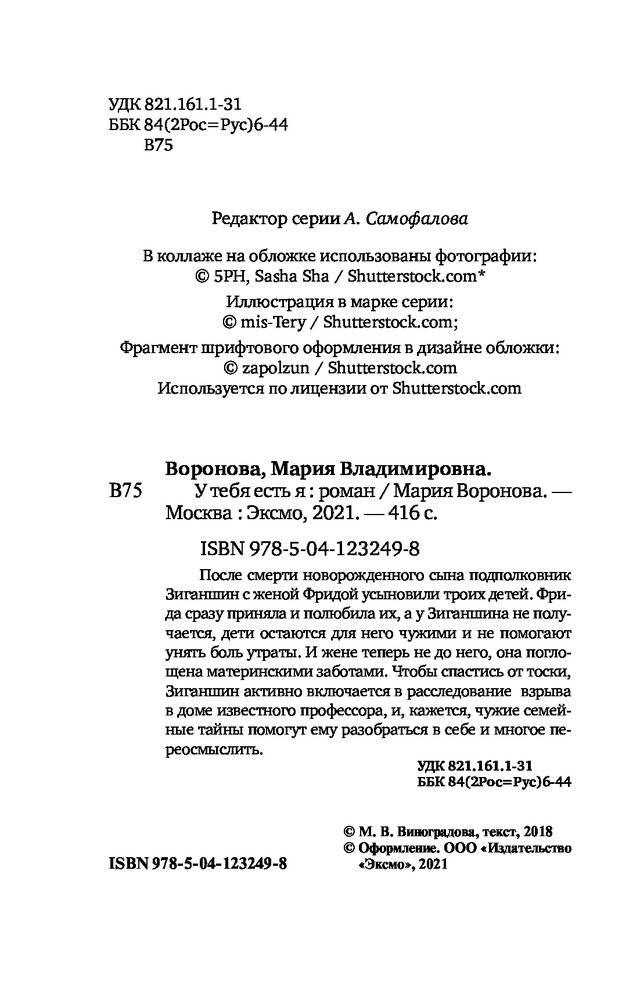 У тебя есть яВ данный момент этот товар отсутствует в продаже. Возможно, у нас найдется аналогичный или похожий товар здесь. Серия: Уютный роман (обложка) После смерти новорожденного сына подполковник Зиганшин с женой Фридой усыновили троих детей. Фрида сразу приняла и полюбила их, а у Зиганшина не получается, дети остаются для него чужими, и не помогают унять боль утраты. И жене теперь не до него, она поглощена материнскими заботами. Чтобы спастись от тоски, Зиганшин активно включается в расследование взрыва в доме известного профессора, и, кажется, чужие семейные тайны помогут ему разобраться в себе и многое переосмыслить. |