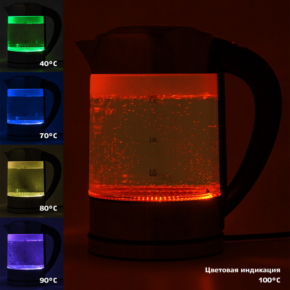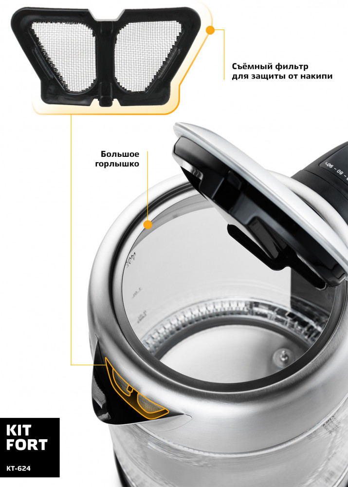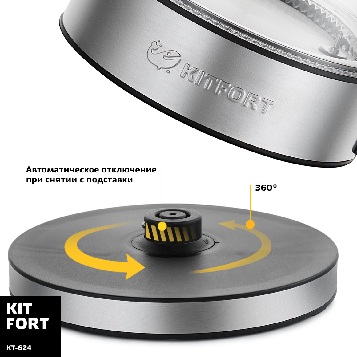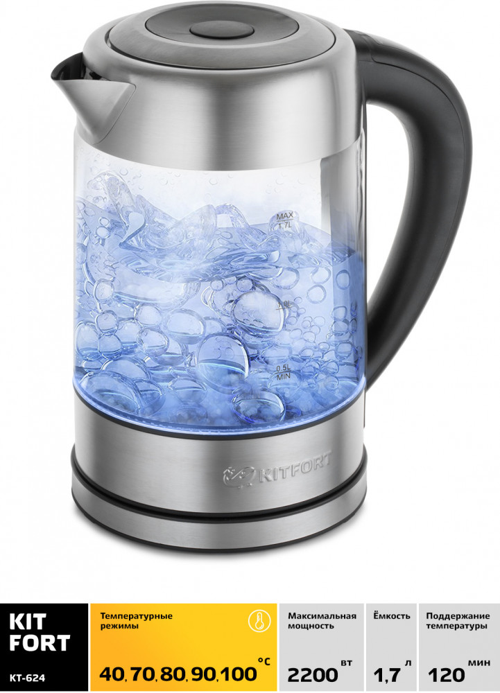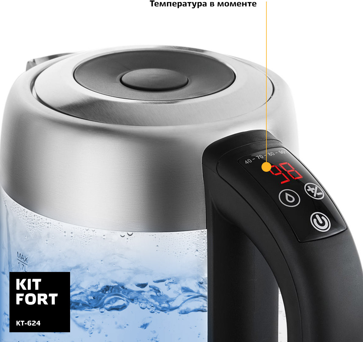 Kitfort Чайник KT-624В данный момент этот товар отсутствует в продаже. Возможно, у нас найдется аналогичный или похожий товар здесь. Электрочайник Kitfort КТ-624 не просто доводит воду до кипения. Вы сможете выбирать из нескольких уровней нагрева, подбирая оптимальный вариант для разных сортов чая: 100 градусов — для чёрного, 90 — для ройбуша и улуна, 70-80 — для зелёного. Каждому режиму соответствует подсветка определённого цвета. |