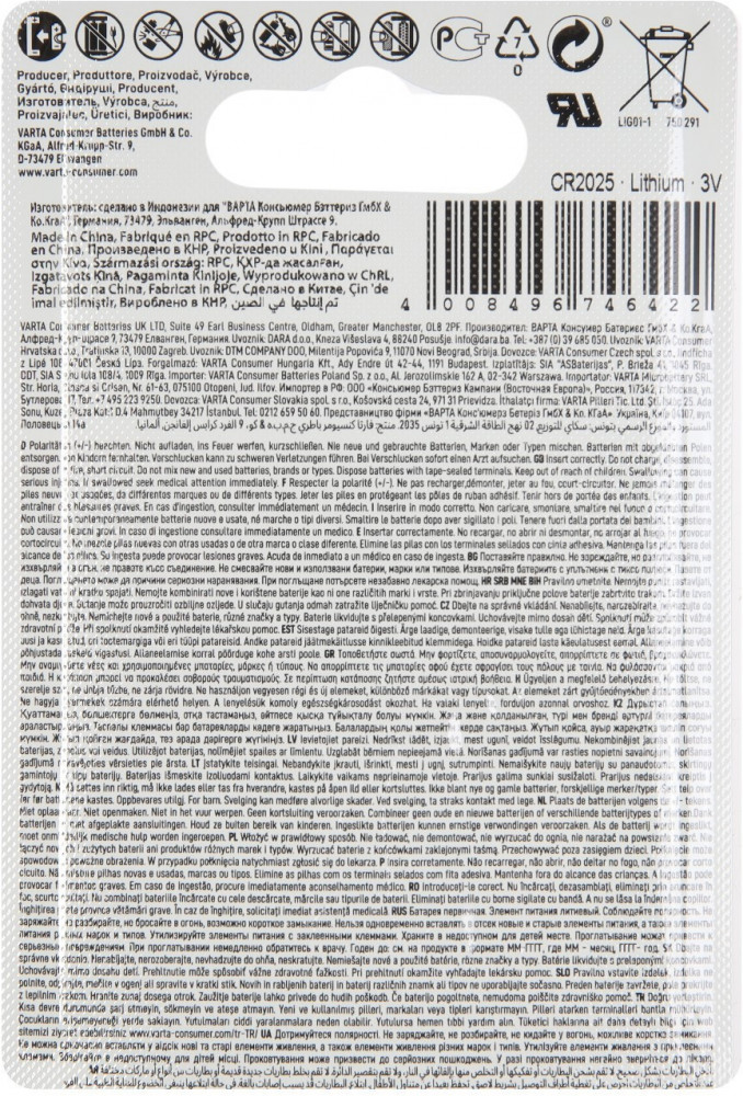 Varta Набор батареек литиевых CR2025+58