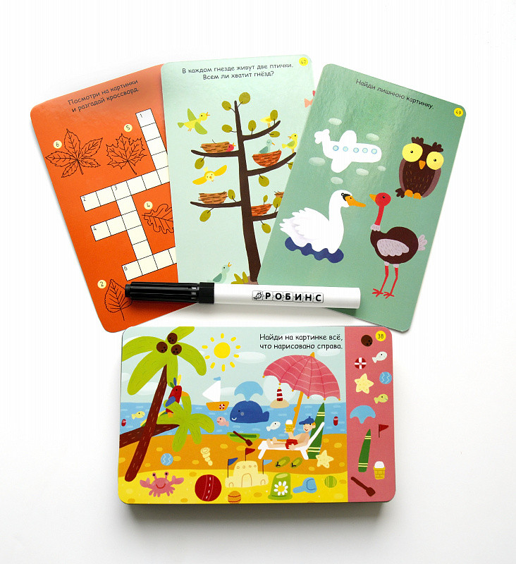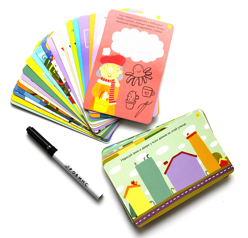 Карточки многоразовые, надпись легко стирается, задании очень много, дети выполняли задания с удовольствием. Покупкой очень довольна