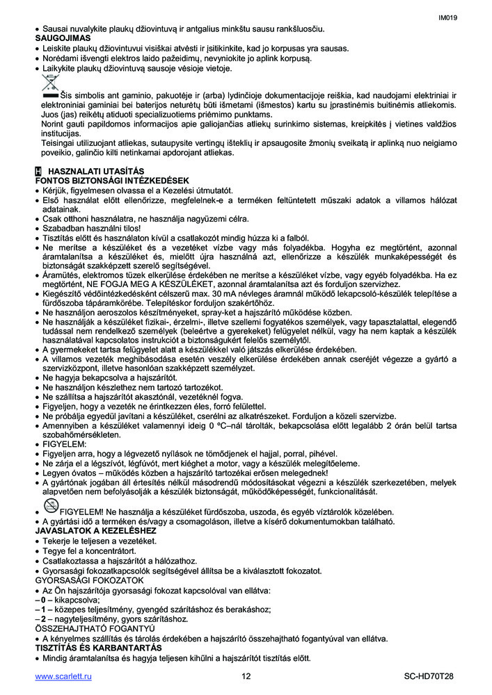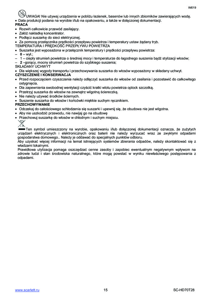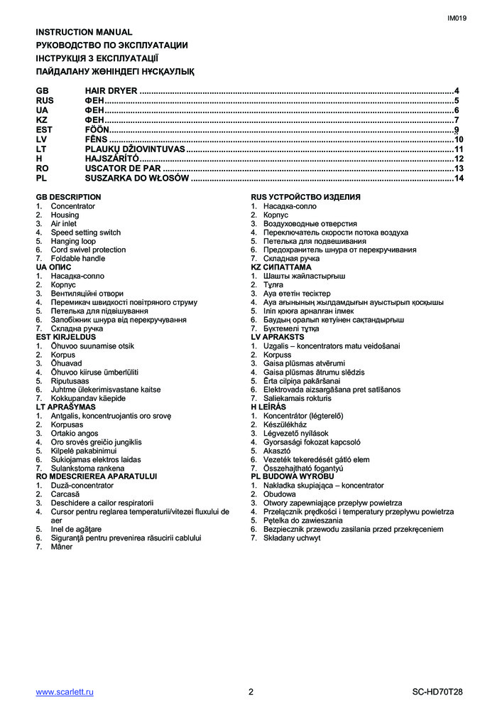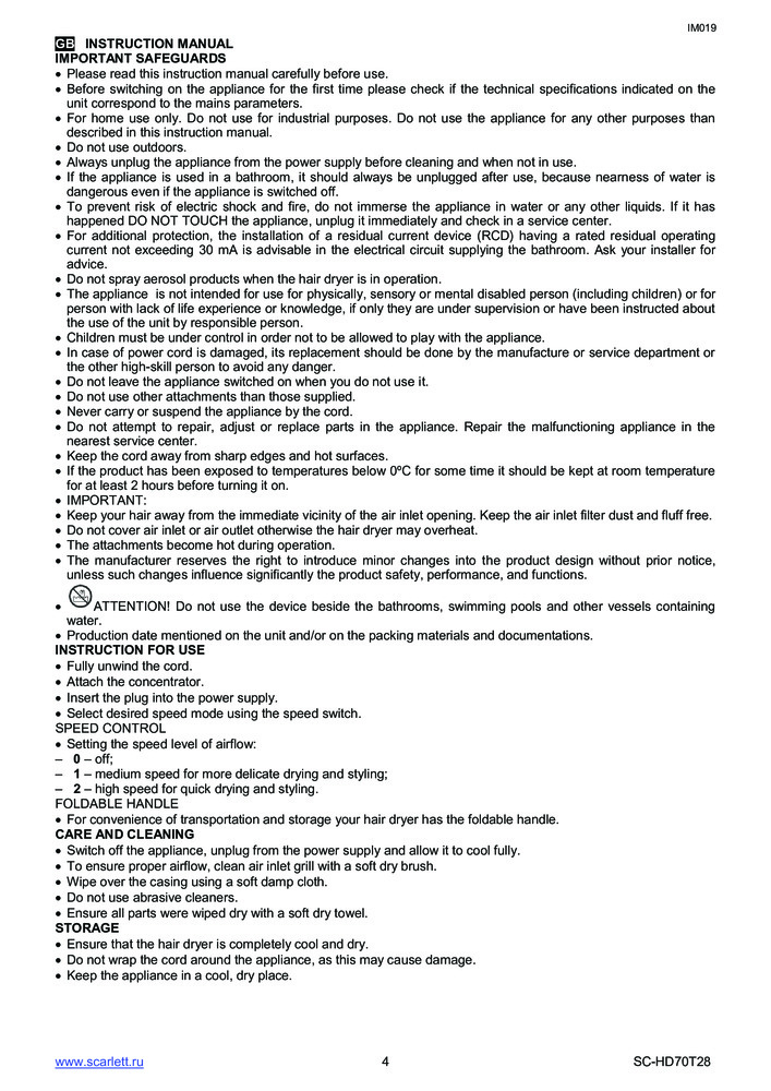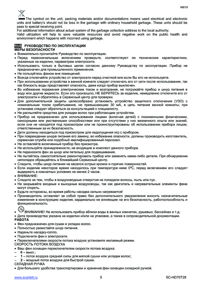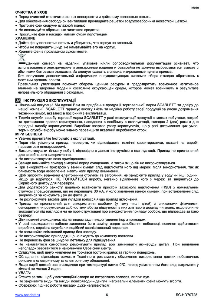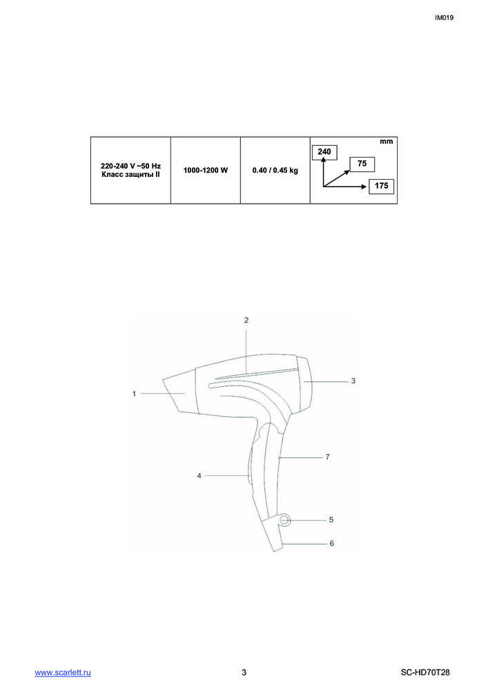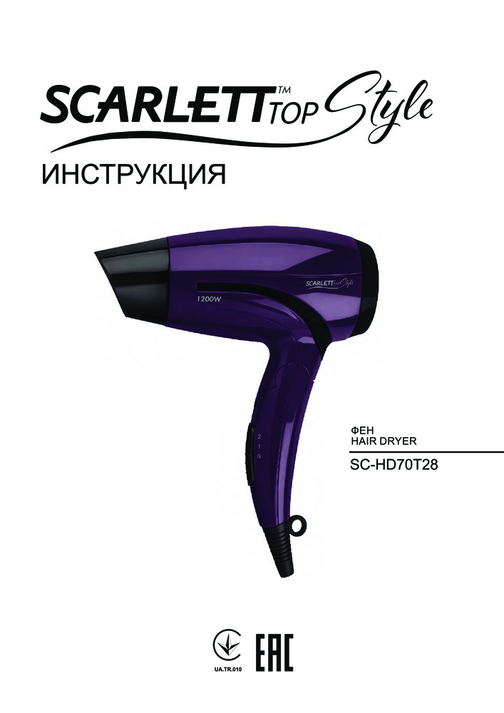 Фен Scarlett SC-HD70T28 оснащен съемным воздушным фильтром, который при необходимости можно очистить от накопившихся в нем загрязнений. Имеется насадка-концентратор, обеспечивающая быструю укладку и сушку волос, а также их завивку при помощи бигуди. За счет складной ручки устройство займет минимум места в вашем багаже. При необходимости вы сможете повесить фен на крючок при помощи специальной петли, располагающейся у основания ее шнура.