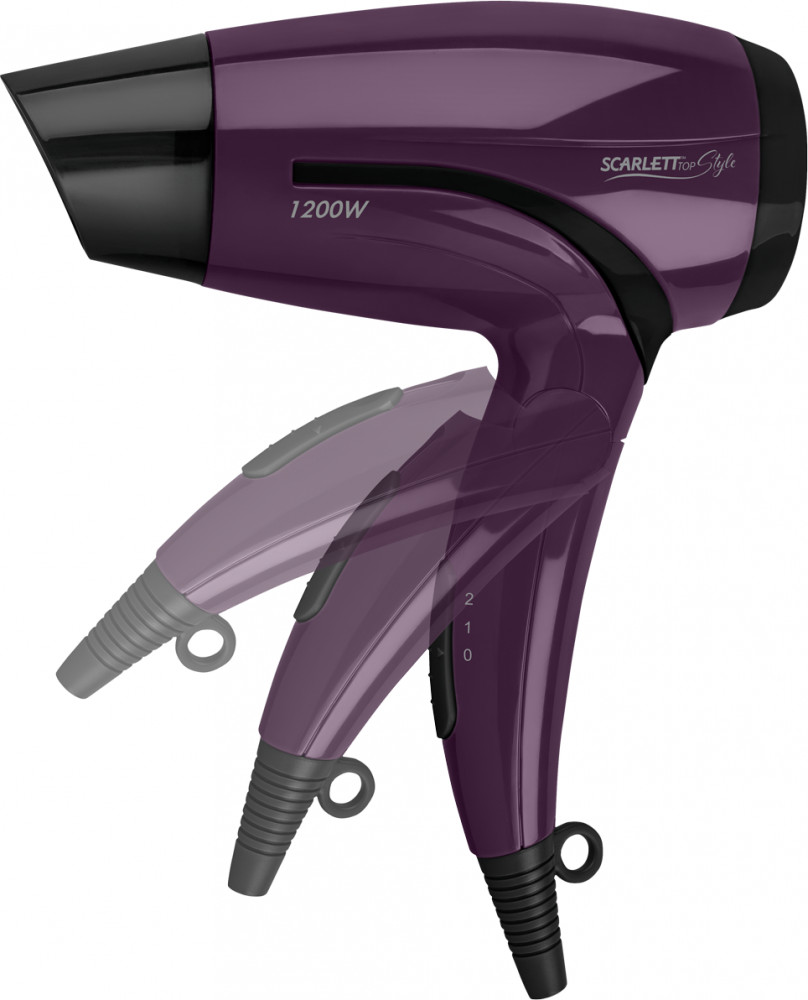 Фен Scarlett SC-HD70T28 представлен в ультракомпактном дизайне, благодаря которому он сможет сопровождать вас в любой поездке, предоставляя вам возможность быстро высушить волосы и создать аккуратную укладку. Стильная черно-фиолетовая расцветка корпуса этого электроприбора делает его привлекательным для любой девушки. За счет высокой мощности, равной 1200 Вт, на сушку волос уйдет минимум времени. В зависимости от длины и типа волос, а также желаемого результата вы сможете настроить параметры работы устройства при помощи двух температурных и двух скоростных режимов.