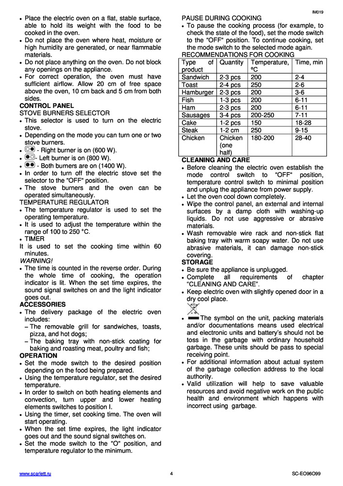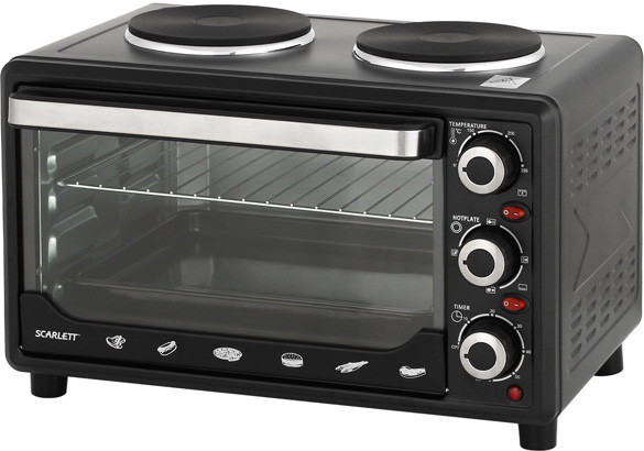 Scarlett Электропечь SC-EO96O99В данный момент этот товар отсутствует в продаже. Возможно, у нас найдется аналогичный или похожий товар здесь. Кухонная плита Scarlett SC-EO96O99 — прибор 4-в-1: кухонная плита с 2 конфорками! Оснащена SC-EO96O99 конвекцией, для равномерного распределения температуры, световым индикатором, таймер на 60 минут со звуковым сигналом. 2 конфорки разного размера могут работать одновременно, а также верхний и нижний гриль. В комплект входят съемная решетка и поддон с покрытием из жаропрочной эмали. |