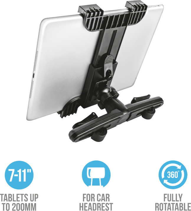 С держателем от Trust появляется возможность установки планшетного компьютера на любой подголовник. Смотрите видео с заднего сиденья. Подходит для всех планшетных компьютеров (также для компьютеров в защитном силиконовом чехле). Крепится держатель очень прочно и легко с помощью надежных защелок. Подходит для всех планшетных компьютеров с диагональю экрана от 7 до 11 дюймов.