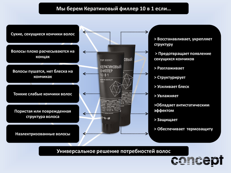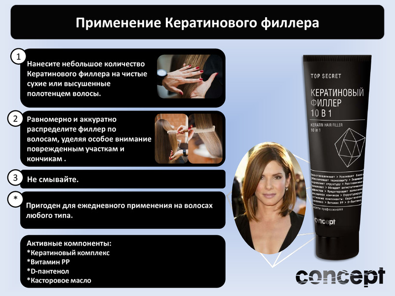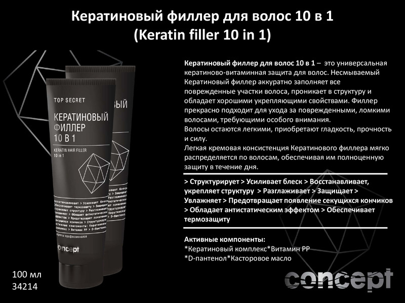 Concept Филлер для волос кератиновый 10 в 1В данный момент этот товар отсутствует в продаже. Возможно, у нас найдется аналогичный или похожий товар здесь. Серия: Top Secret Кератиновый филлер для волос 10 в 1 — это концентрированная, универсальная, кератиново-витаминная защита для волос. Несмываемый кератиновый филлер аккуратно заполняет все поврежденные участки волоса, проникает в структуру и обладает хорошими укрепляющими свойствами. Филлер прекрасно подходит для ухода за поврежденными, ломкими волосами, требующими особого внимания. |
