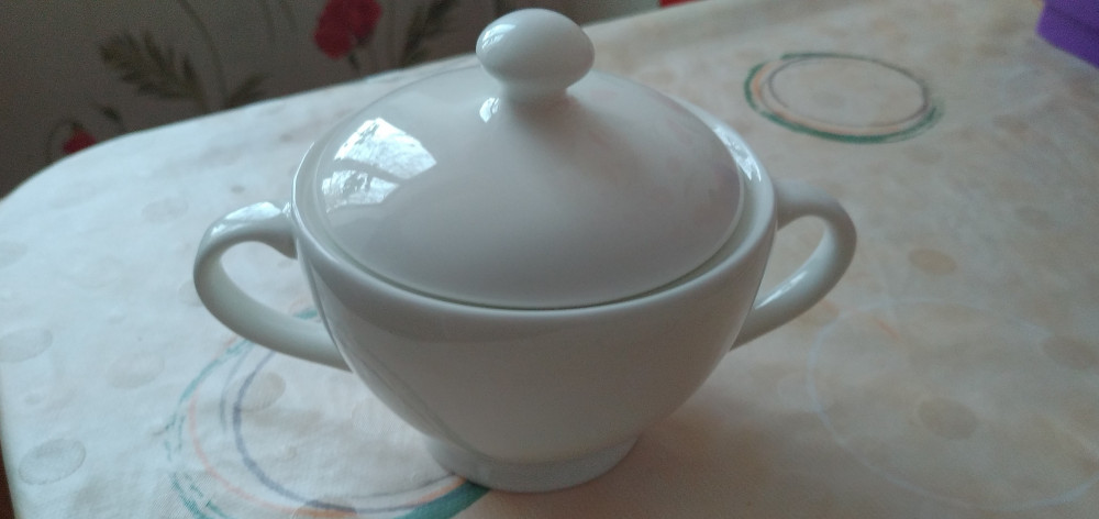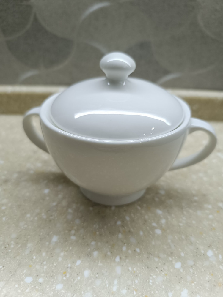Сахарница чуть меньше привычного размера, но очень удобной формы, горлышко широкое. Фарфор очень хорошего качества, звенит.