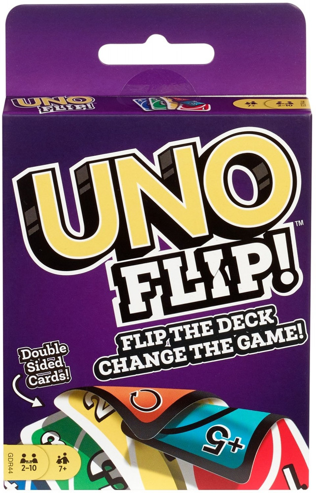 Mattel. Inc. Игра настольная «UNO Flip»В данный момент этот товар отсутствует в продаже. Возможно, у нас найдется аналогичный или похожий товар здесь. В популярной настольной игре UNO теперь появились новые интересные карты и неожиданные правила! Двусторонняя колода и специальная флип-карта придадут классической игре дополнительную динамику. При выпадении флип-карты вся колода переворачивается обратной стороной и игра продолжается с новым набором чисел и цветов у каждого участника. Также в колоду UNO FLIP добавлены новые активные карты, например, «Возьми пять» и «Пропусти всех». Если у тебя осталась одна карта, не забудь крикнуть «Uno!» и ты станешь победителем. Эта увлекательная настольная игра соберет вокруг себя всю семью и отлично подойдет для большой компании. |
