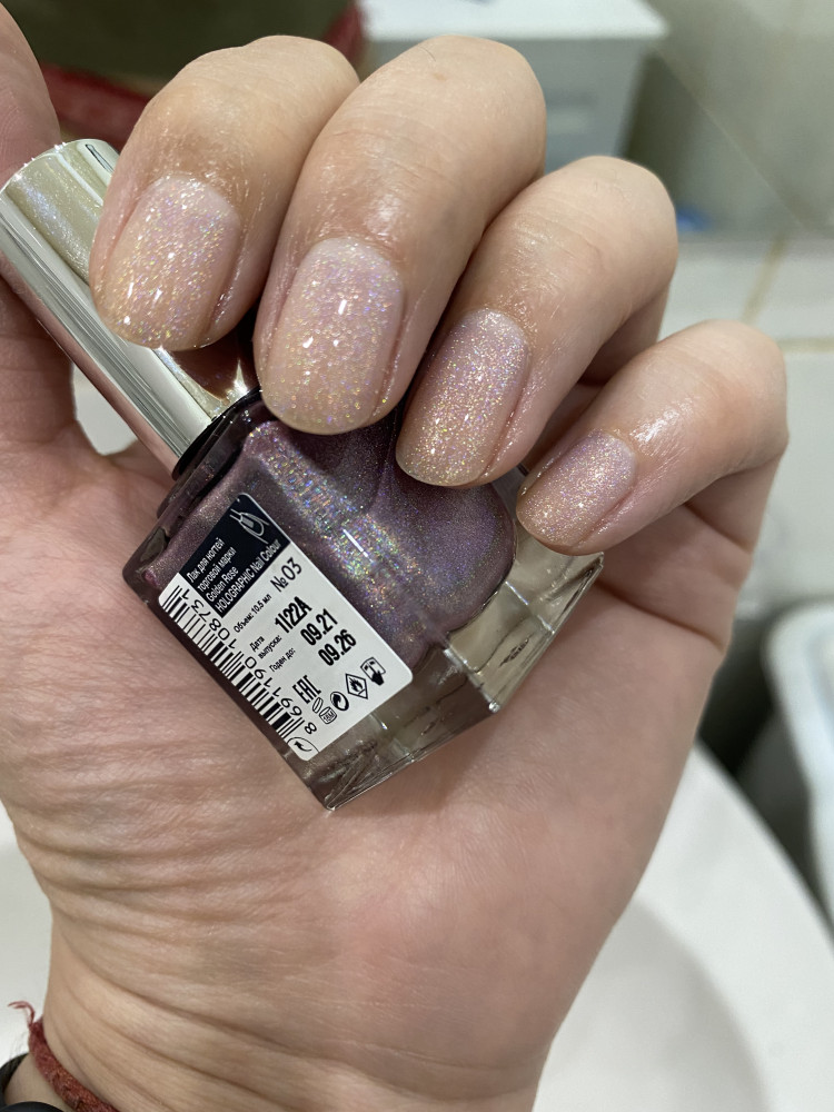 Наносится хорошо. Нанесла один слой на обезжиренные спиртом ногти. Высох довольно быстро при помощи сушки от essencе. Блестит красиво. Взяла оттенок 02. Мелкие радужные блестки на бежевой основе.