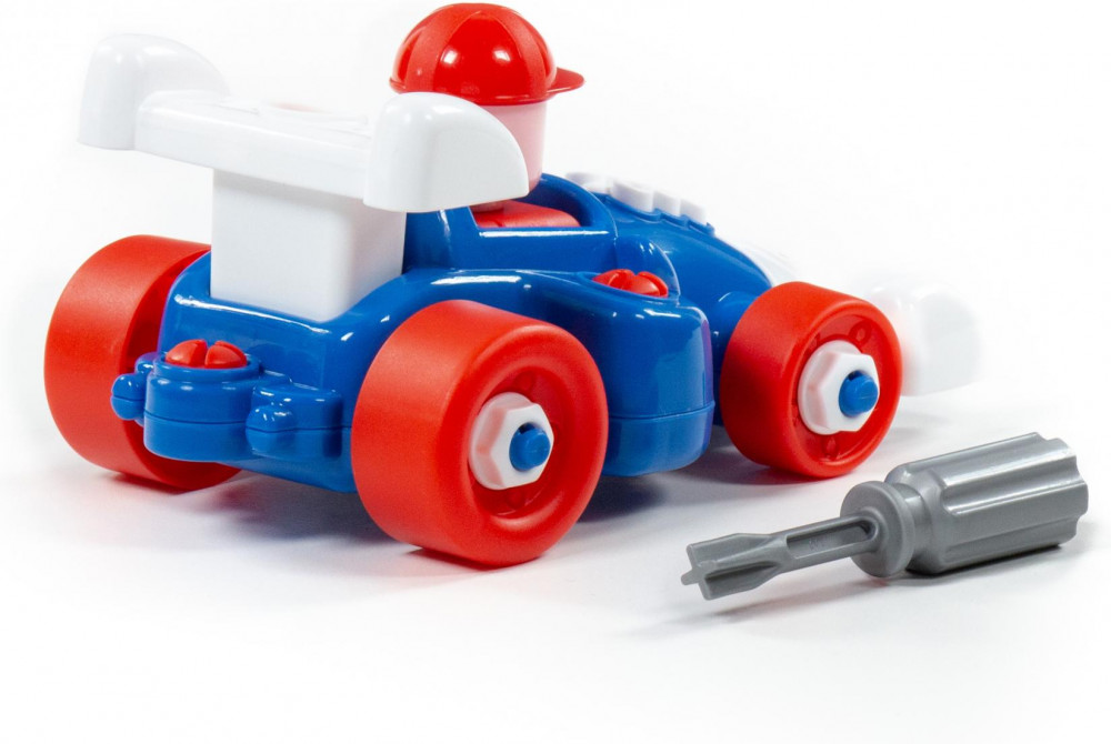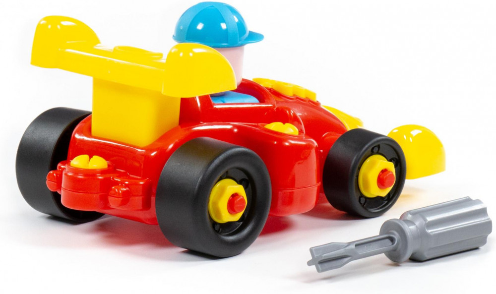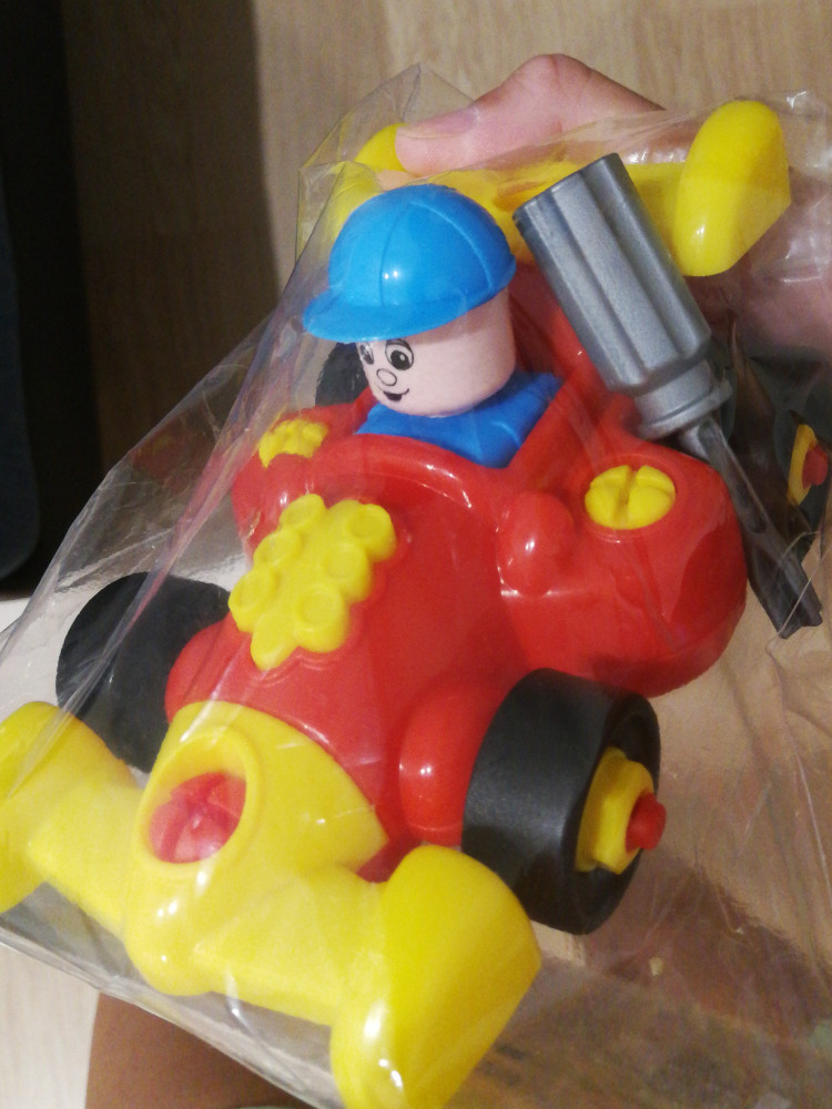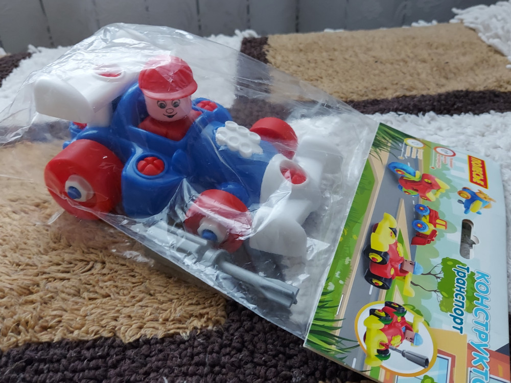 Очень классная, не маленькая - больше взрослой ладони. Можно катать - колёса крутятся и откручивать болтики и гаечки. Позитивный человечек. Качество пластика у «ПОЛЕСЬЕ» всегда на высоте - неубиваемые игрушки)