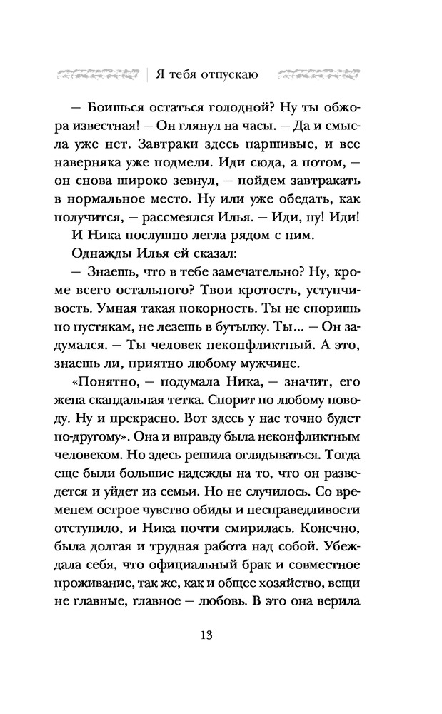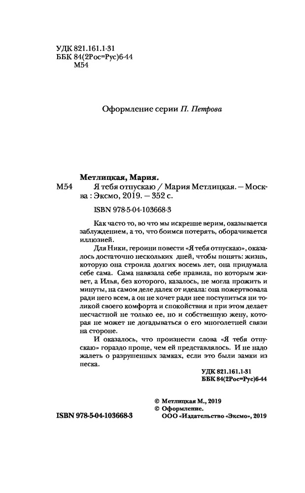 💳 Оплатить за товар можно при получении 🇰🇿 Есть бесплатная доставка по Казахстану от 1 дня 🎁 Копите бонусы с каждой покупки Серия: Женские судьбы. Уютная проза Марии Метлицкой Как часто то, во что мы искренне верим, оказывается заблуждением, а то, что боимся потерять, оборачивается иллюзией. Для Ники, героини повести «Я тебя отпускаю» оказалось достаточно нескольких дней, чтобы понять: жизнь, которую она строила долгих восемь лет, она придумала себе сама. Сама навязала себе правила, по которым живет, а Илья, без которого, казалось, не могла прожить и минуты, на самом деле далек от идеала: она пожертвовала ради него всем, а он не хочет ради нее поступиться ни толикой своего комфорта и спокойствия и при этом делает несчастной не только ее, но и собственную жену, которая не может не догадываться о его многолетней связи на стороне.И оказалось, что произнести слова «Я тебя отпускаю» гораздо проще, чем ей представлялось. И не надо жалеть о разрушенных замках, если это были замки из песка. |