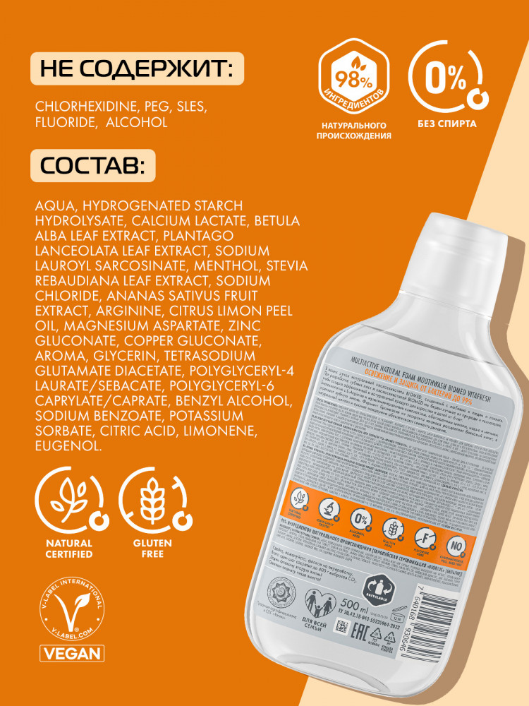 Не знаю, как насчет пены, но ничего подобного нет, как пишут другие... Во-первых, чувствуется спирт, и потом вяжет рот. Во-вторых, нет долгого ощущения свежести во рту, как из этой же серии "виноградный" - вот у него на много приятнее вкус, и свежесть чувствуется во рту. А, у этого - ни вкуса, ни цвета, ни запаха... Не понравился.