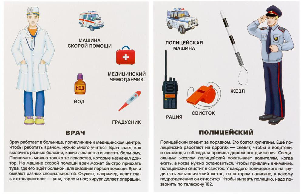 Для гармоничного развития ребенку необходимо получать информацию из разных областей, в том числе ребенку будет интересно узнать, какие существуют профессии. Набор карточек в папке — прекрасный материал для 10 развивающих занятий.
