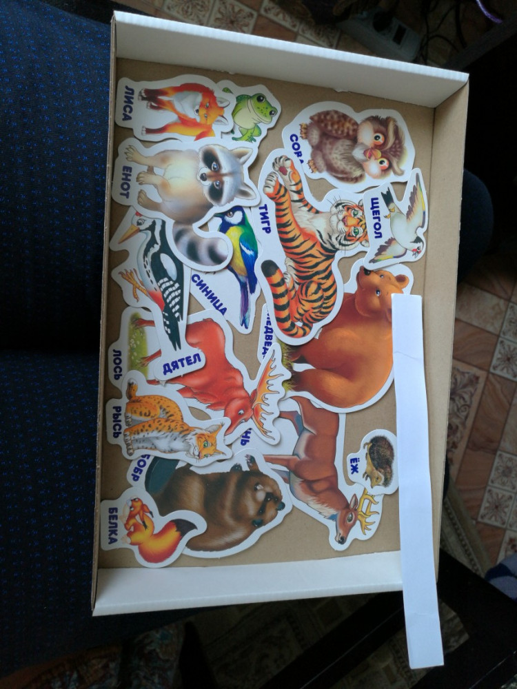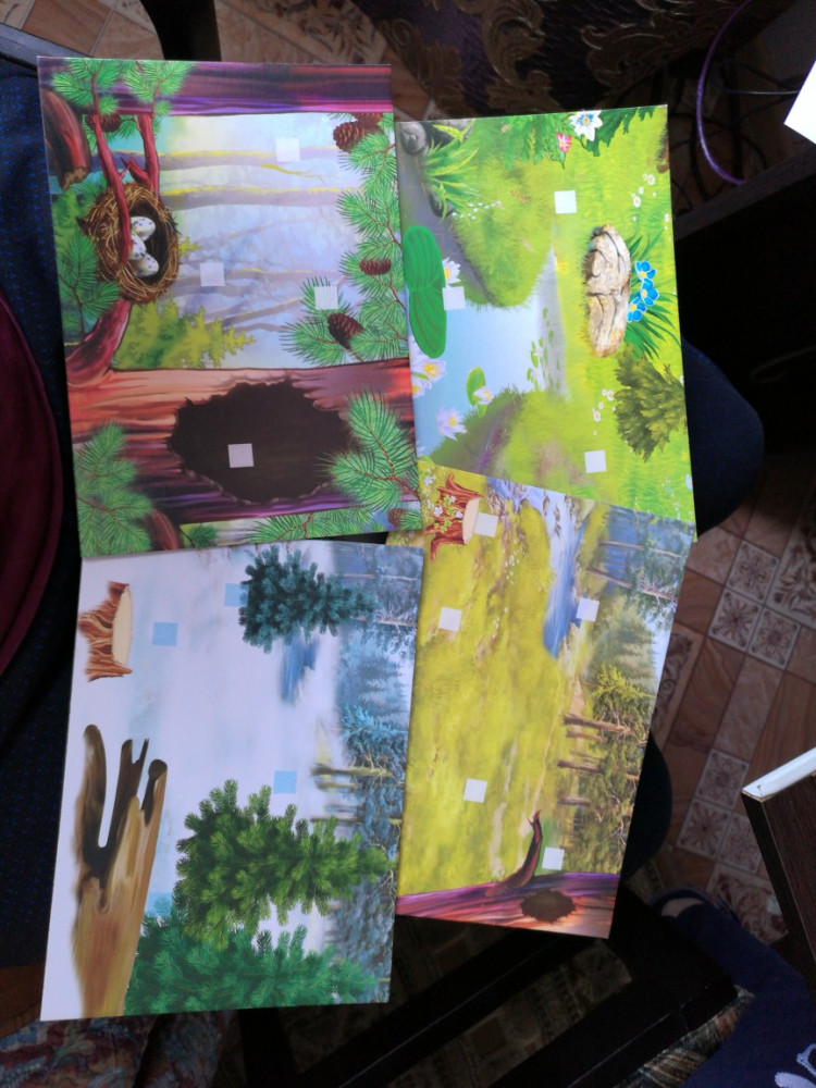 В целом не плохой комплект. 4 картонных поля для размещения животных, животные из более тонкого картона, и липучая лента которую нужно самим разрезать и приклеить к животным и полям.