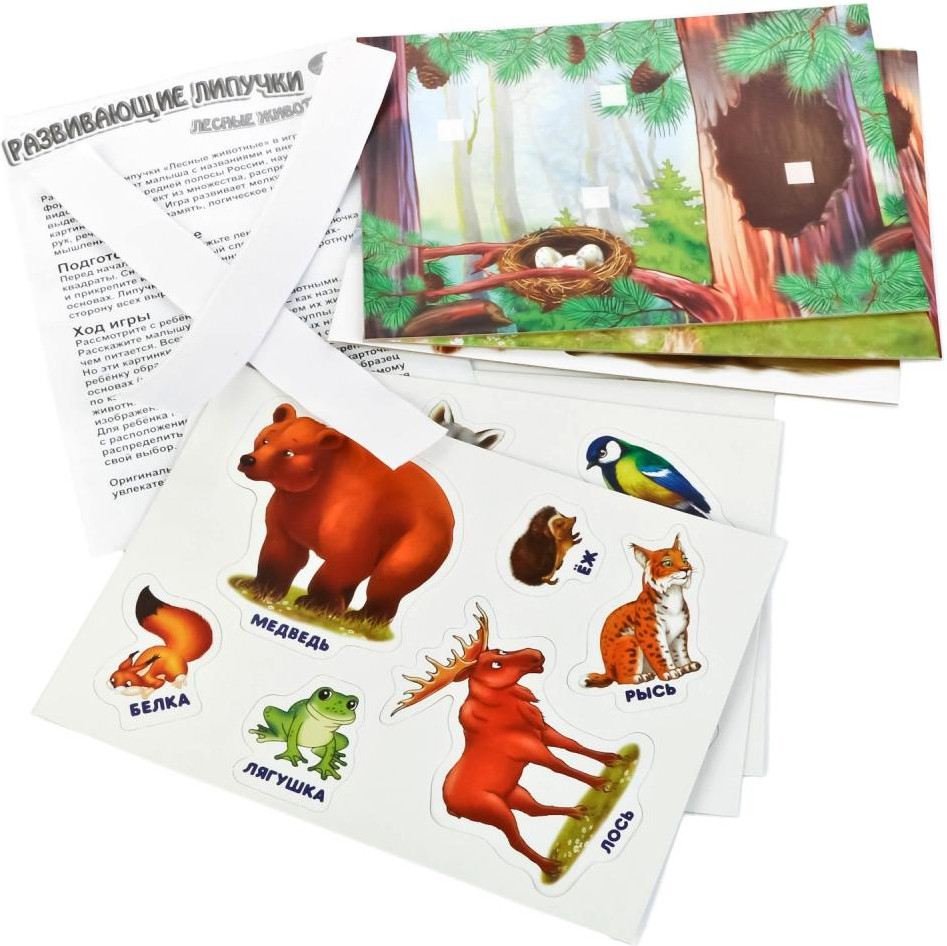 Игра с липучками «Лесные животные» — развивающая интерактивная новинка для мальчиков. В процессе игры ребёнок должен будет найти для каждого животного своё место на карточке и прикрепить его на липучку. Например, птичку нужно прикрепить на ветку рядом с гнездом, а белку — рядом с дуплом. Ребёнок может экспериментировать и размещать животных на разных карточках сколько угодно раз — липучки очень качественные. Играя, ребёнок запомнит, как выглядят лесные животные и где они живут, попутно развивая мелкую моторику рук, ассоциативное мышление, логику и кругозор.