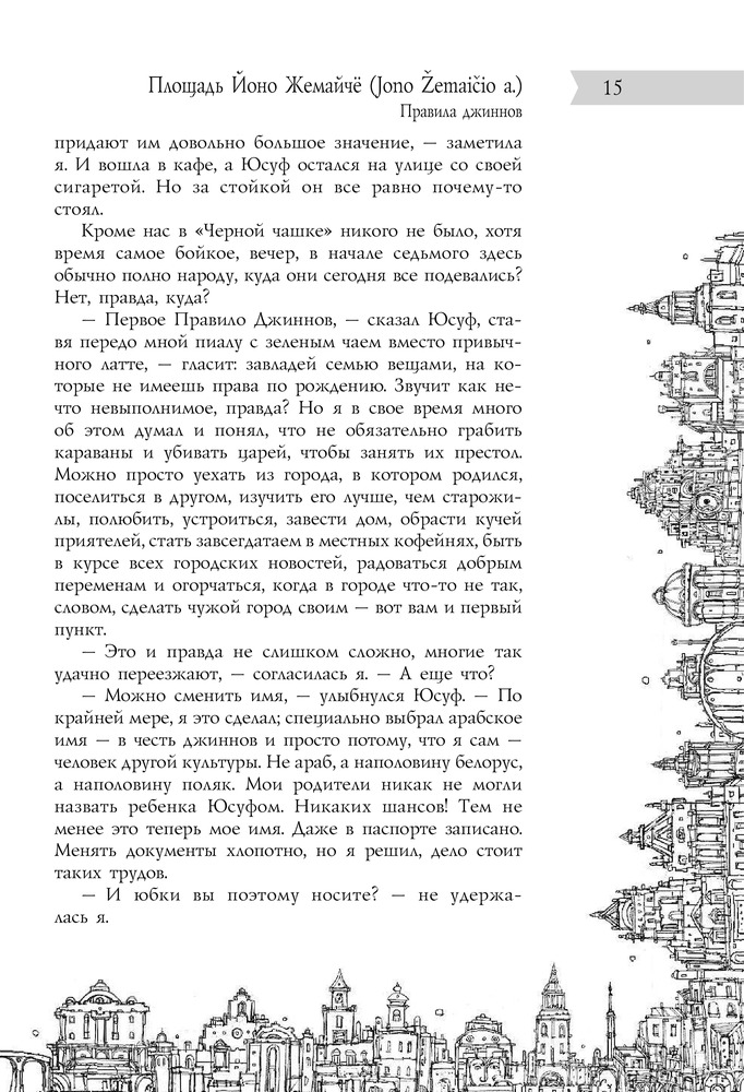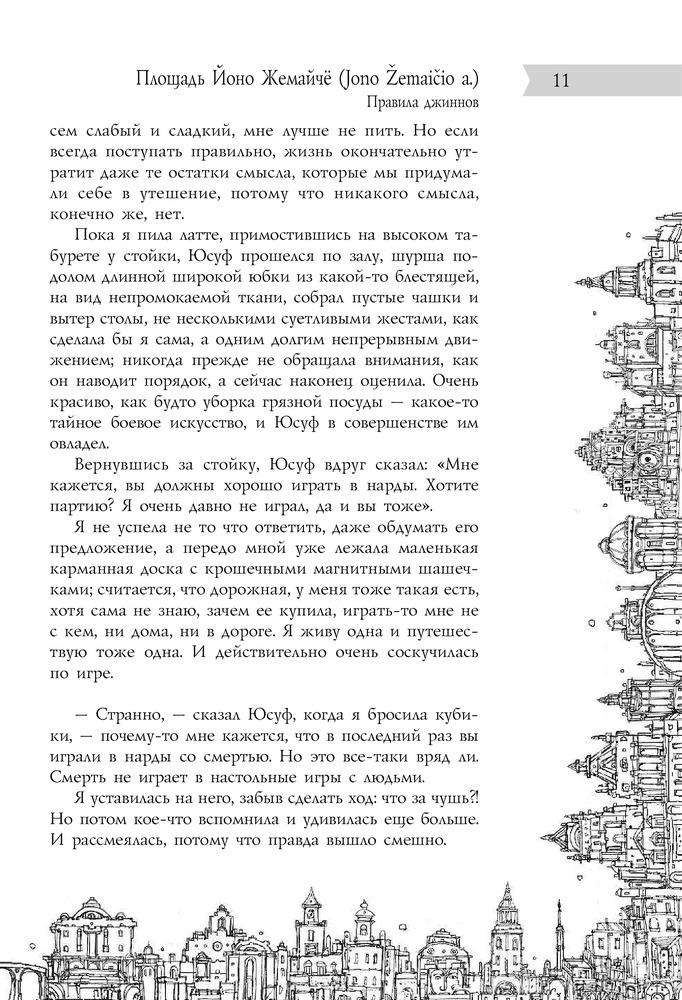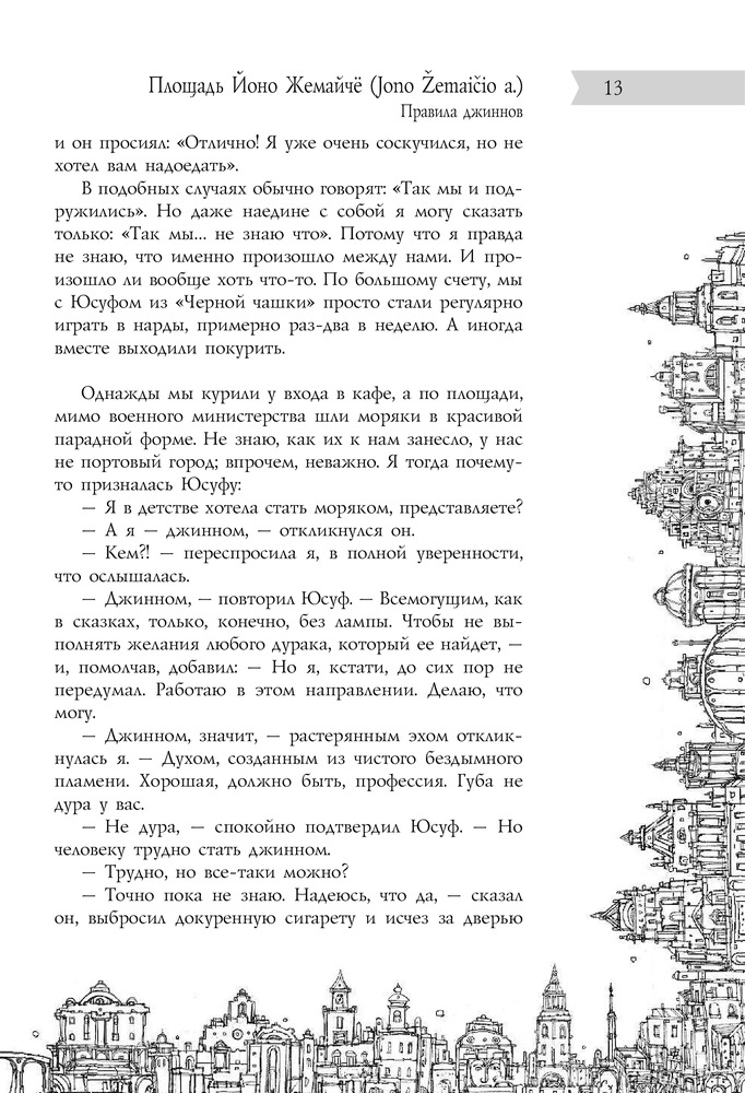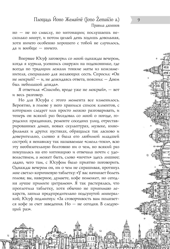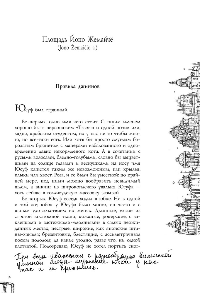 «В Старом городе Вильнюса, как выяснилось, сто сорок семь улиц, переулков, площадей, рынков и мостов; зная характер нашего города, мы не сомневаемся, что это число еще не раз изменится, здесь у нас чуть ли не каждый день что-нибудь появляется и исчезает, а всем кажется, всегда так и было — это одно из правил нашей тайной повседневной игры...» |