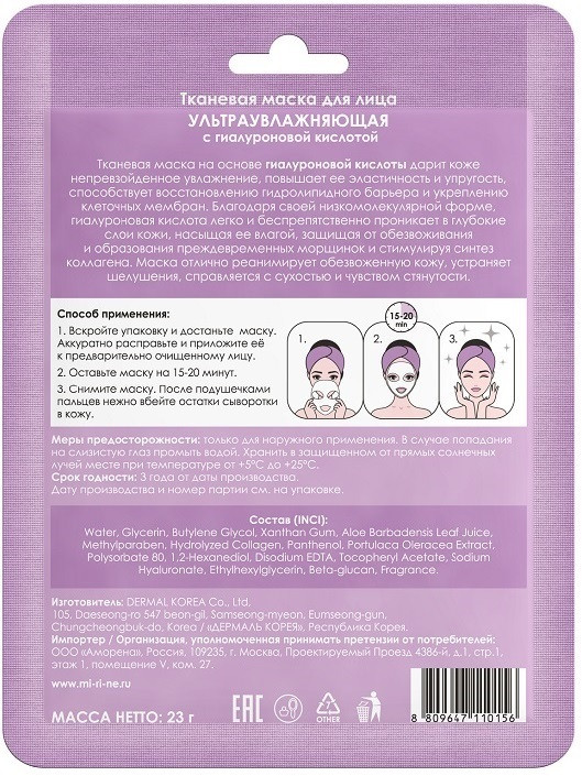Отзывы «Маска для лица тканевая ультраувлажняющая с гиалуроновой кислотой»