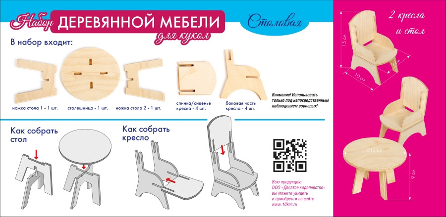 💳 Оплатить за товар можно при получении 🇰🇿 Есть бесплатная доставка по Казахстану от 1 дня 🎁 Копите бонусы с каждой покупки Набор деревянной мебели для кукол «Столовая» представляет собой простой 3-D конструктор, который легко собрать даже ребенку от четырех лет и старше. Игрушечная деревянная мебель для кукол «Столовая» дает большой простор детской фантазии и предполагает возможность изменения дизайна с применением наклеек, выжигания по дереву, безопасных красителей или их комбинации. При изготовлении игрушечной мебели использована фанера высшего качества толщиной 6 миллиметров. Оптимальный размер куклы не более 25 сантиметров. |