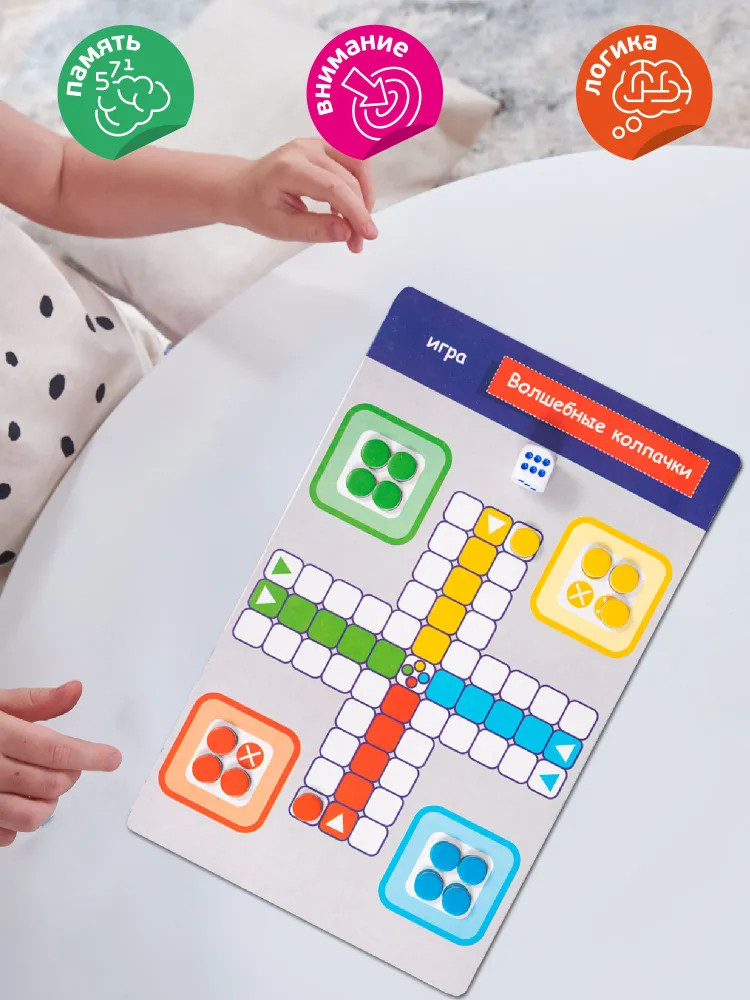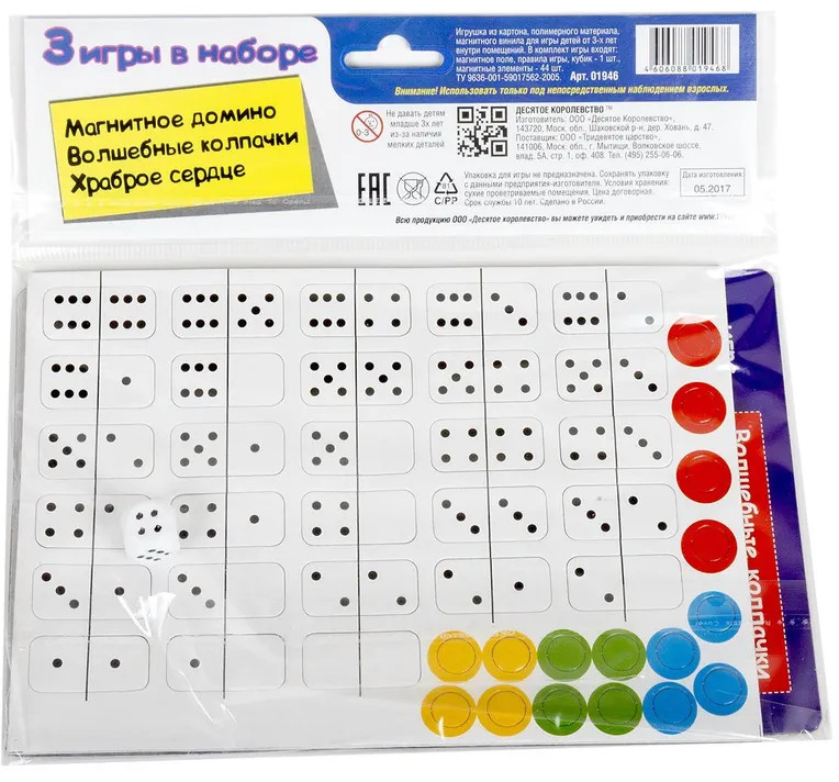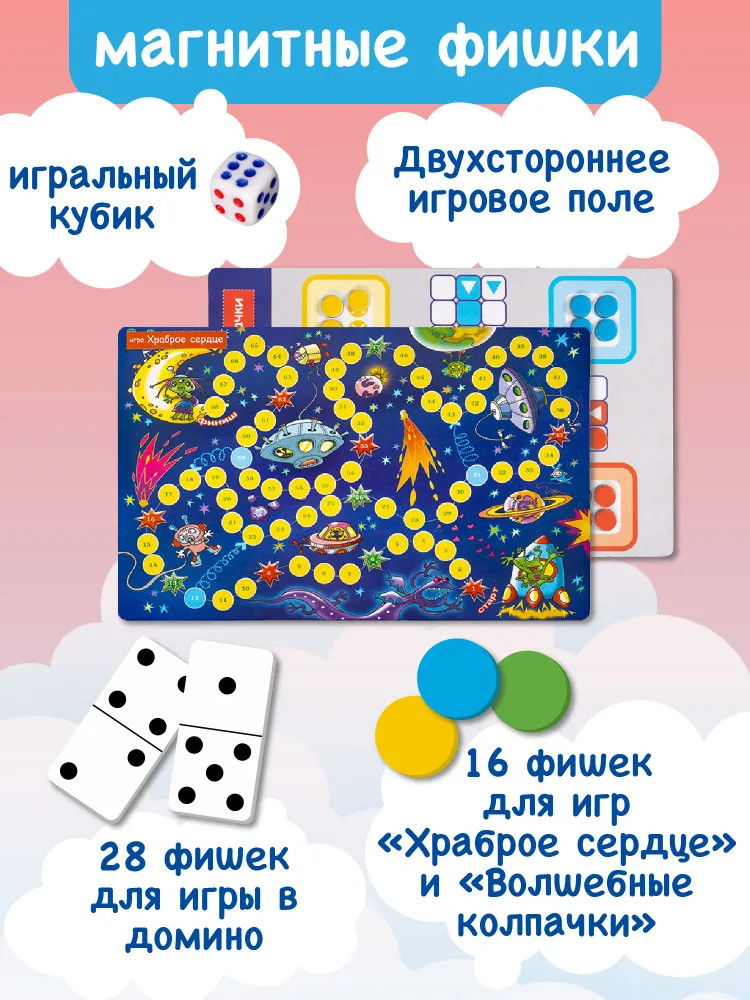 Комплектация: двухстороннее магнитное игровое поле — 1 шт. (для игры «Храброе сердце» с одной стороны, «Волшебные колпачки» с другой), магнитные фишки для игры в домино — 28 шт., магнитные фишки для игры в «Храброе сердце» и «Волшебные колпачки» — 16 шт., игральный кубик. |