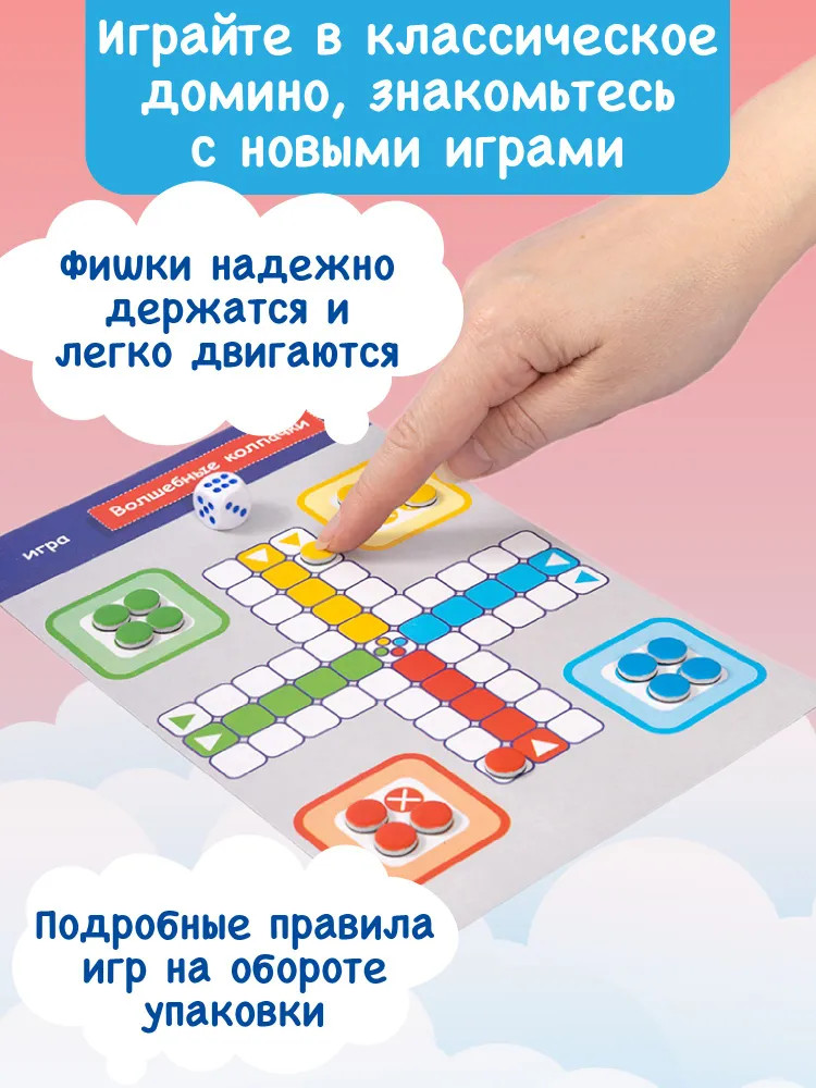 В набор входят следующие игры: игра «Домино», игра «Храброе сердце», игра "Волшебные колпачки«.