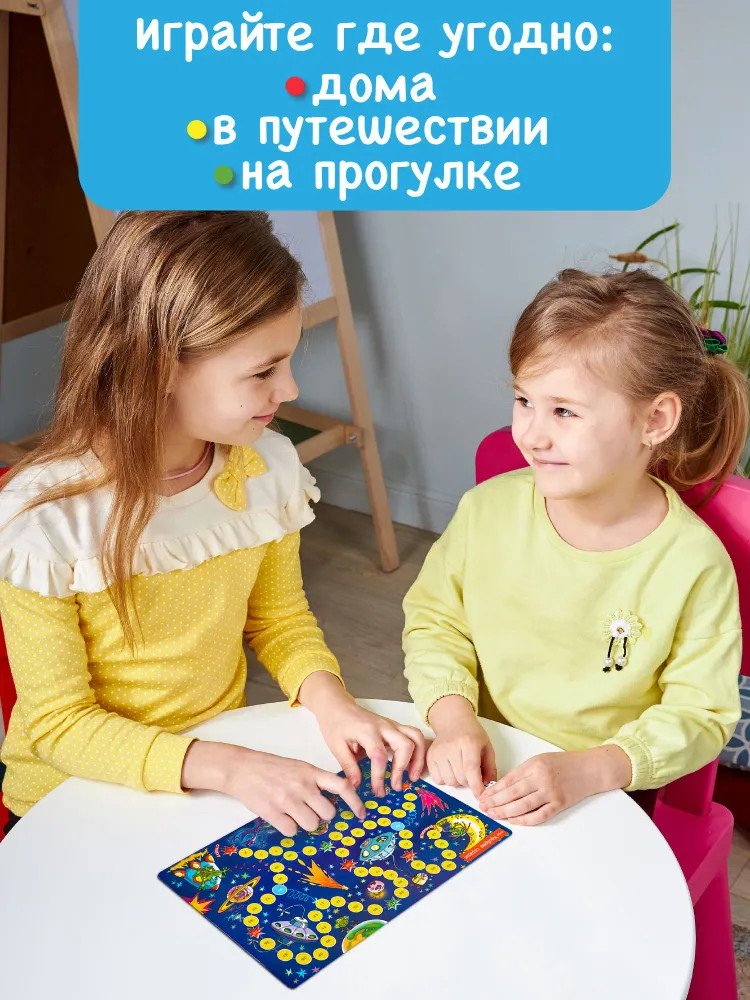 Правила игры: игроки бросают кубик по очереди и продвигают свою фишку вперед по игровому полю на столько кружков, сколько очков выпало на кубике. Если в конце фишка остановилась на кружке другого цвета, игрок поступает следующим образом: красный — пропускает следующий ход, зеленый — ходит еще раз, голубой — перемещает фишку по стрелке. В игре принимают участие 2-4 человека. Побеждает тот, кто первым дойдет до финиша (остановится на последнем кружке или пройдет его).